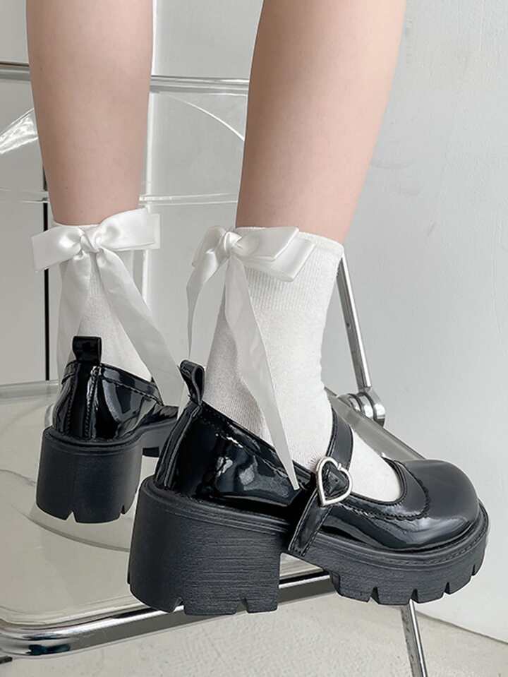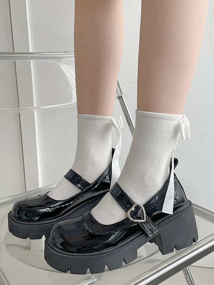 Preppy Black Mary Jane Shoes For Women, Heart Buckle Decor Platform Shoes