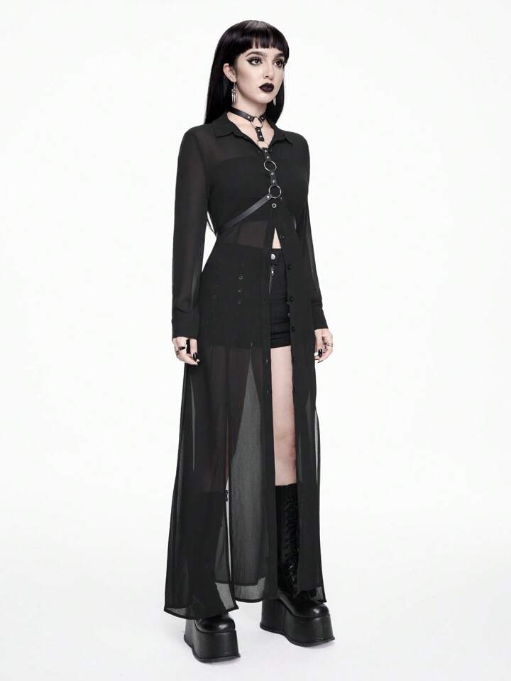 Professional Gothic Style Women's See-Through Shirt Dress With Thigh-High Slit