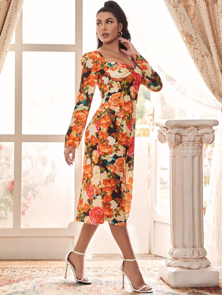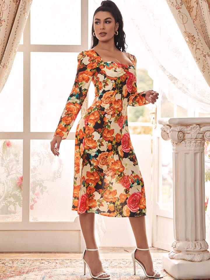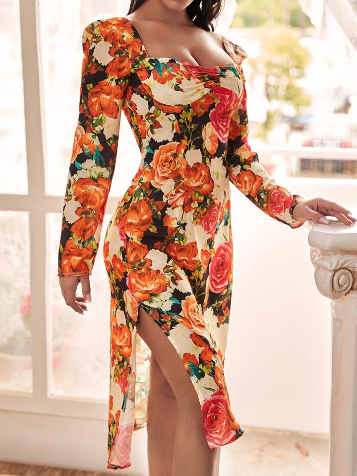 Puff Sleeve Sweetheart Neck Floral Split Thigh Dress