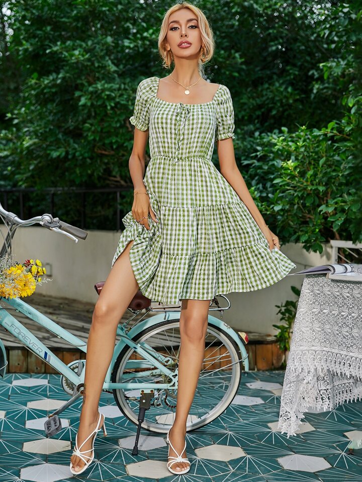 Puff Sleeve Tie Front Gingham & Striped Dress
