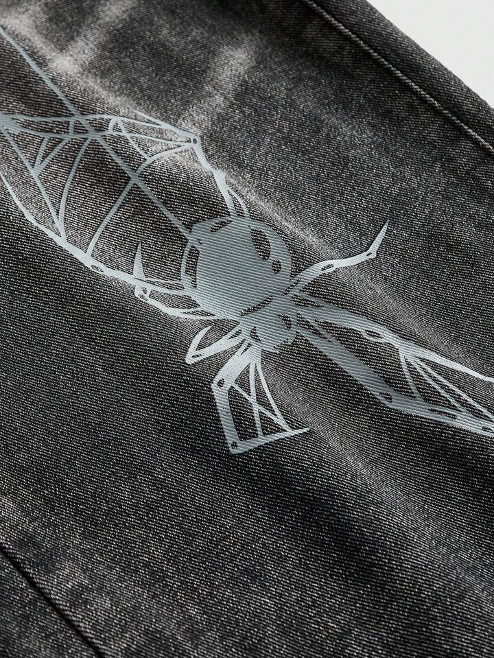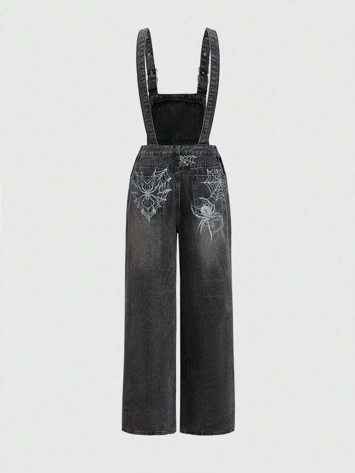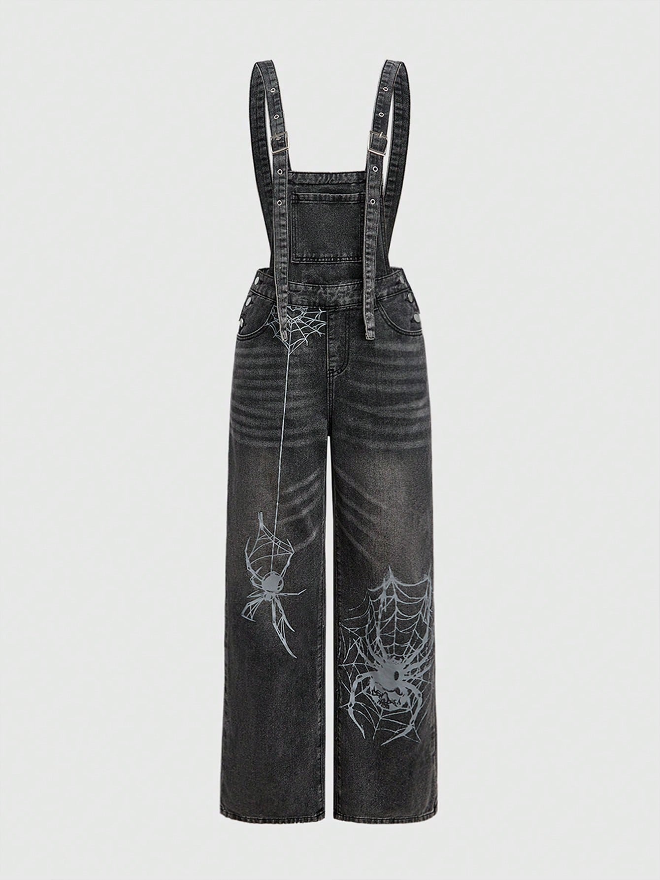 Punk Style Women Distressed Spider Print Straight Leg Boyfriend Denim Overalls