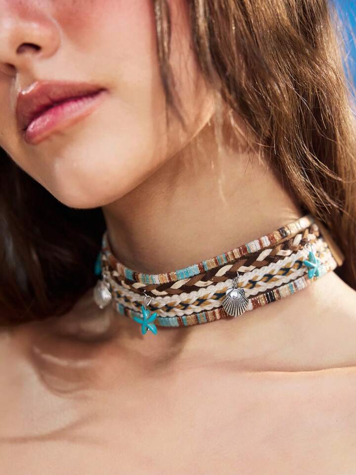 ROMWE Avant 1pc Bohemian Blue Starfish Silver Sea Shell Hat Accessory, Colorful Line Design Headwear, Casual Versatile Unique Styling Accessory