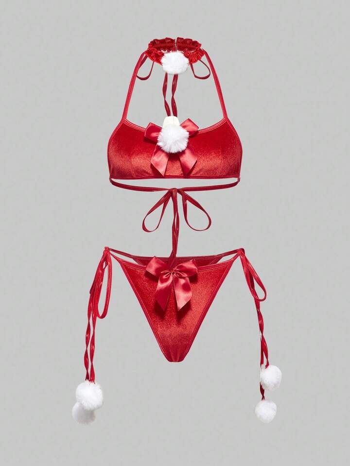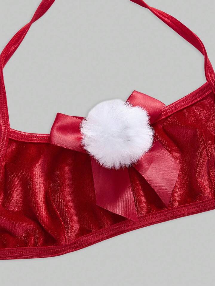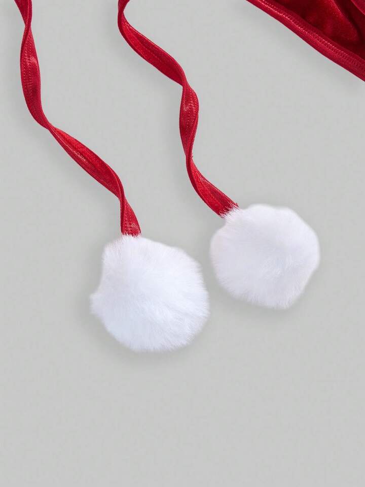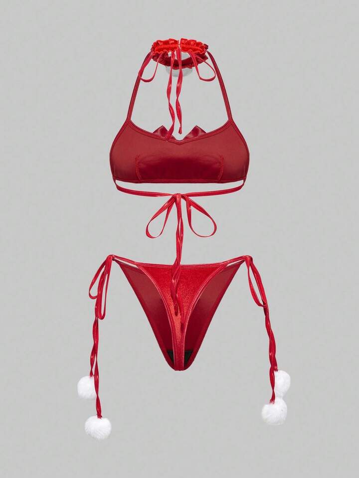 ROMWE Avant 3pcs Women's Christmas Bra, Thong Panty, Neck Collar With Bow & Pom Pom Lingerie Set