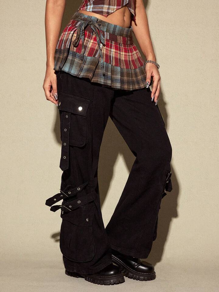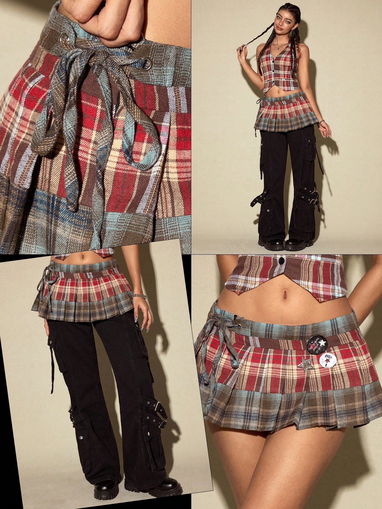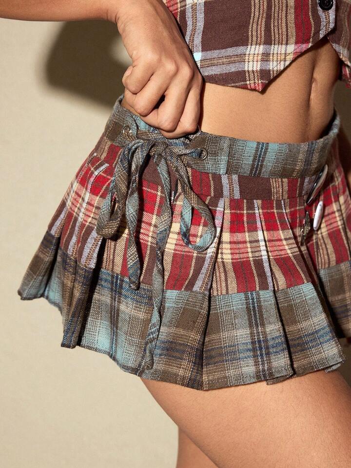 ROMWE Avant Millennium Girl Preppy Style Plaid Patchwork Pleated A-Line Skirt For Women