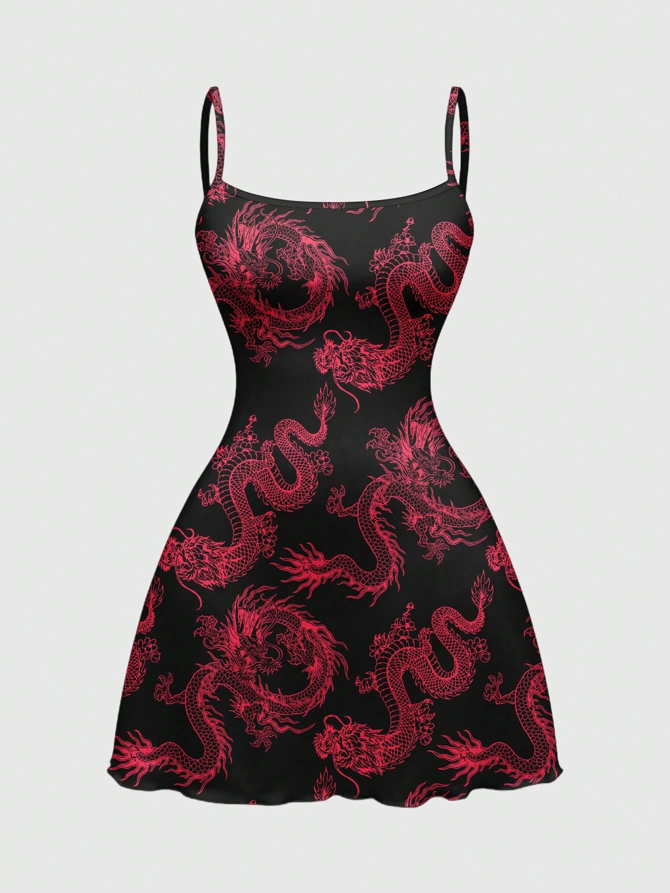 ROMWE Avant New Chinese Style Dragon Print Vintage Sexy Mini Dress, Black & Red Color For Music Festival