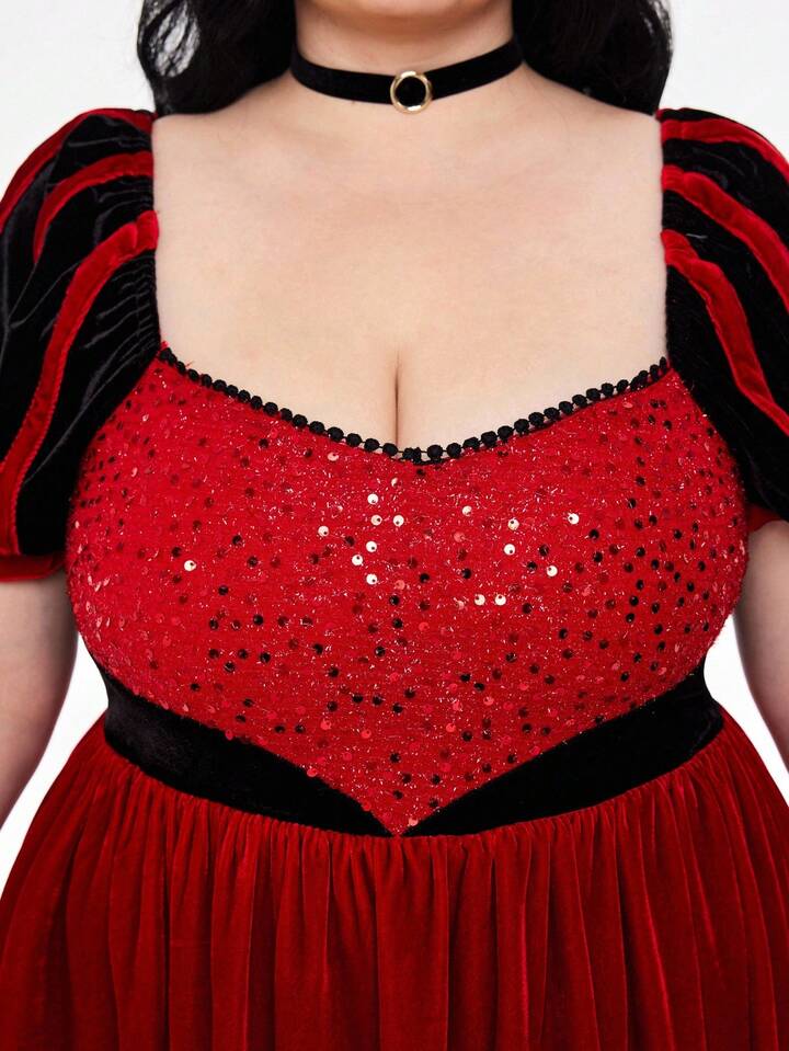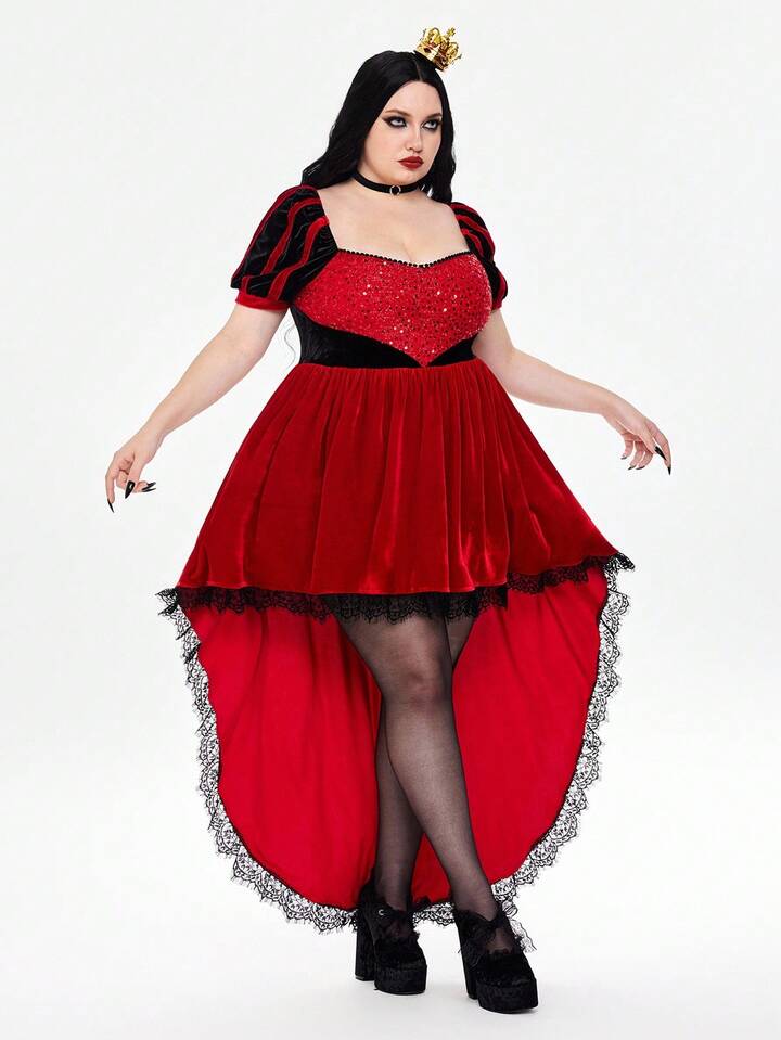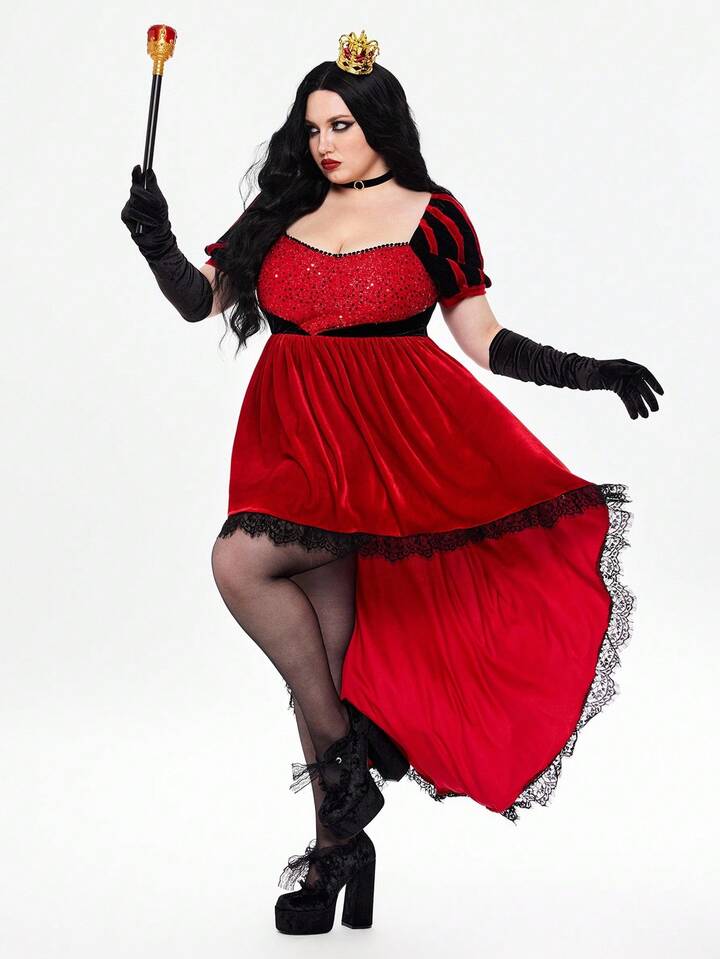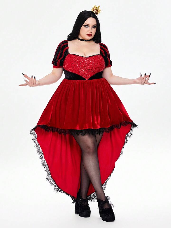 ROMWE Avant Plus Size Halloween Queen Of Hearts Sequin Lace Flared Dress For Party, Plus Size Halloween Costume Dress, Plus Size Party Holiday Outfit