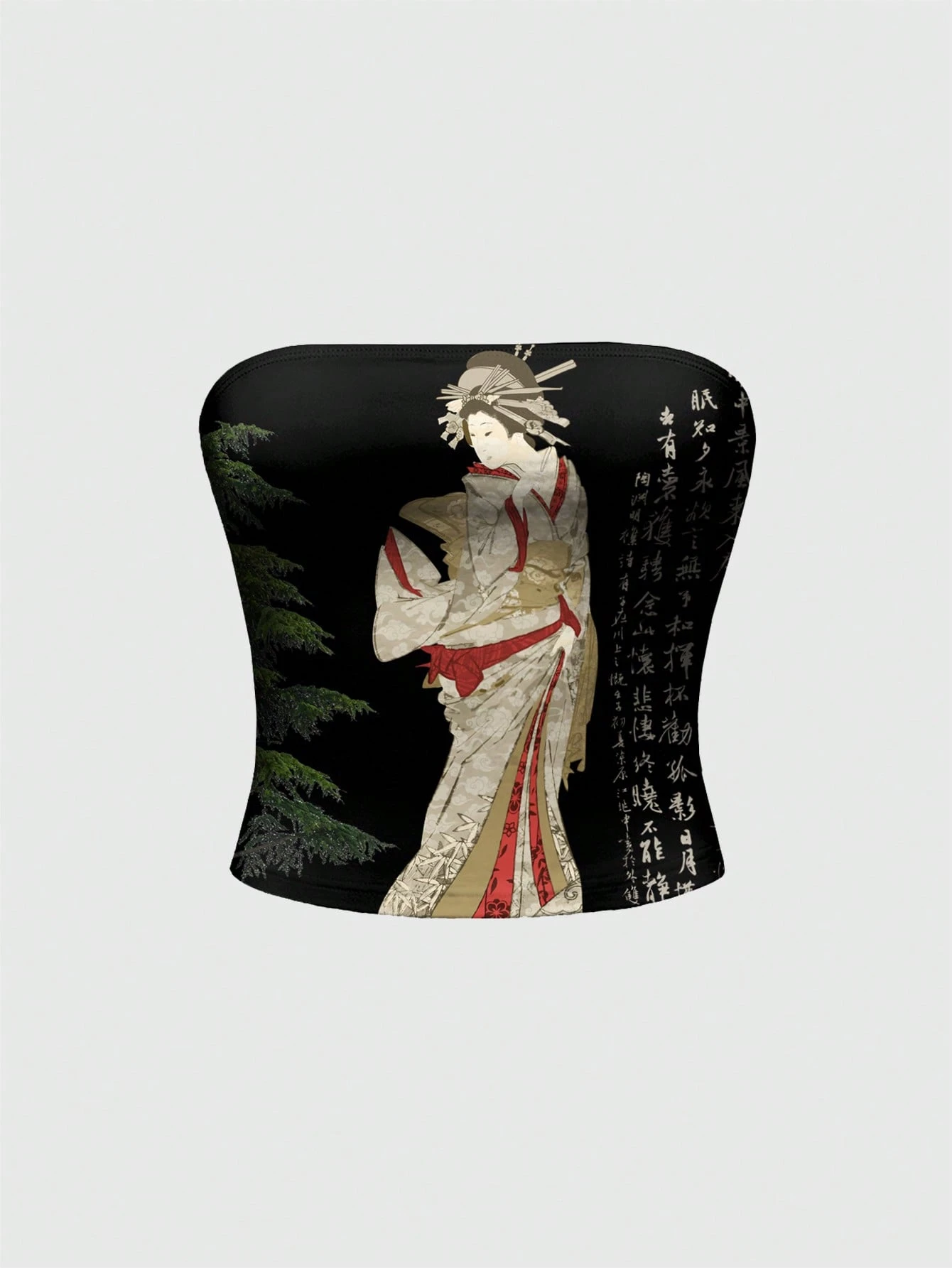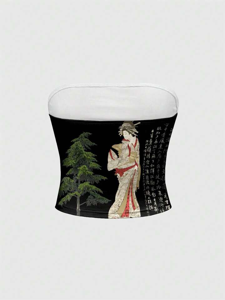 ROMWE Avant Sexy Chinese Calligraphy Figure Print Bandeau Top For Women