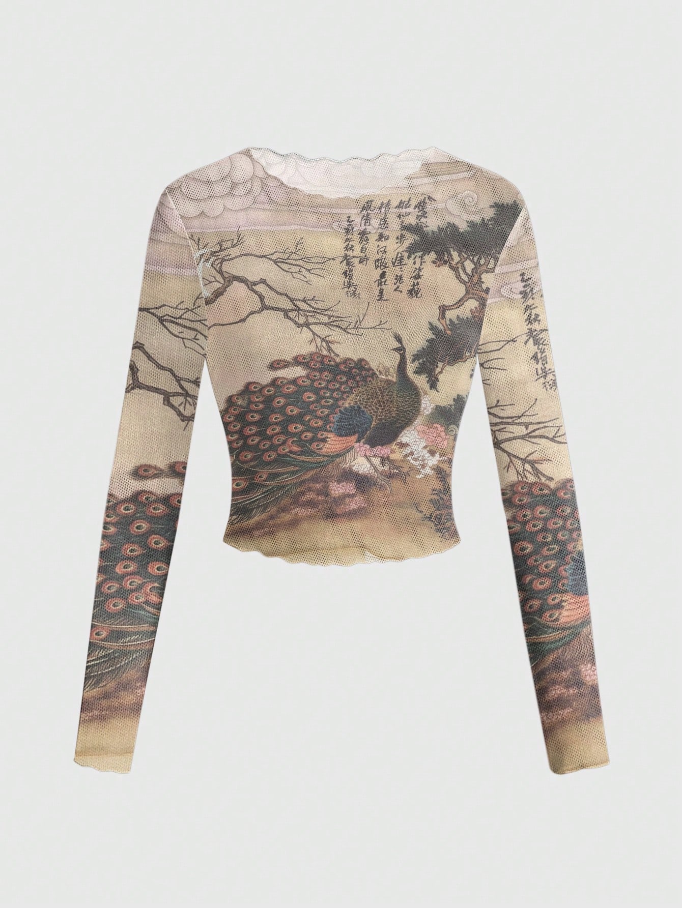 ROMWE Avant Sexy Sheer Mesh Long Sleeve Top With Chinese Calligraphy & Peacock Design