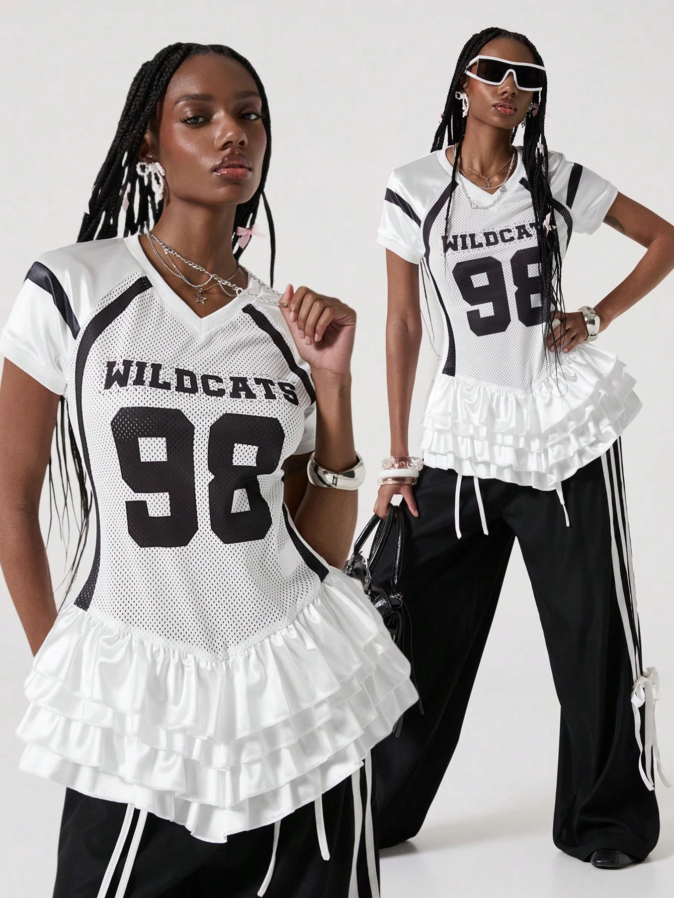 ROMWE Avant Spring/Summer Kawaii Cute Sports Sweet Printed Rhinestone Pearl Ruffle Hem Women Top