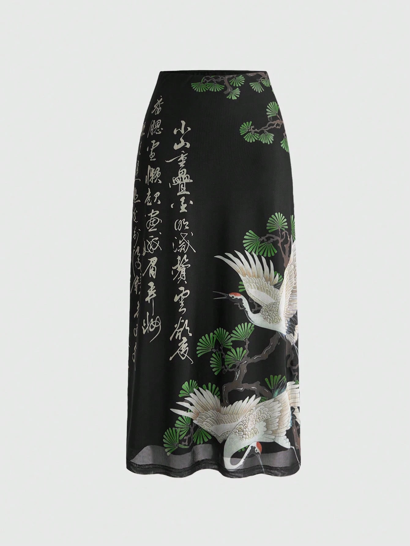 ROMWE Avant Spring/SummergraphicChinese Style Crane & Calligraphy Pine Tree Print Slit Skirt For Women