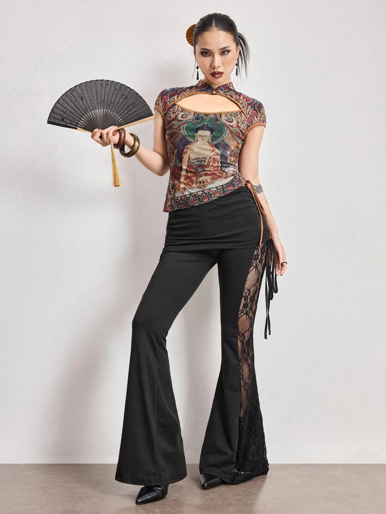ROMWE Avant Spring/SummergraphicVintage Chinese Style Buddha Graphic Drawstring Women Blouse