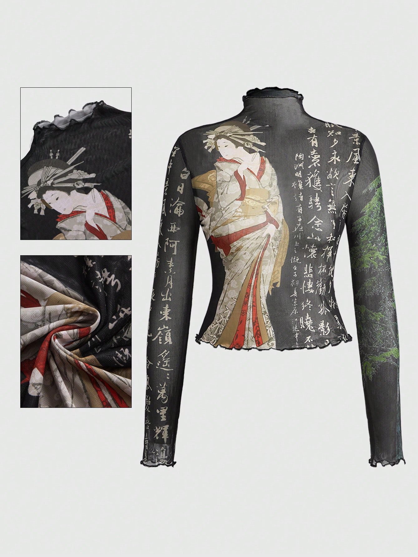 ROMWE Avant Spring/SummergraphicVintage Japanese Geisha & Pine Tree Calligraphy Print Fitted Women Mesh Top