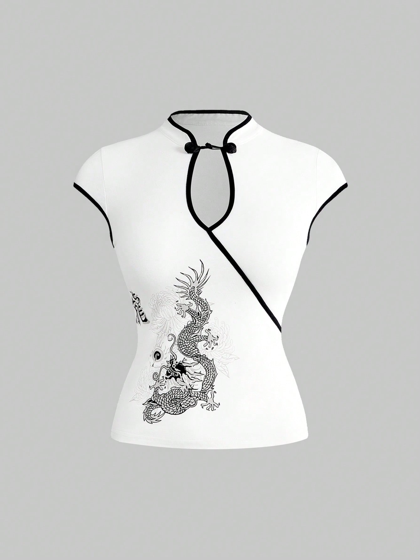 ROMWE Avant Spring/SummergraphicwhiteRetro New Chinese Style Mandarin Collar Dragon & Chinese Character Print Tight Fitted Top