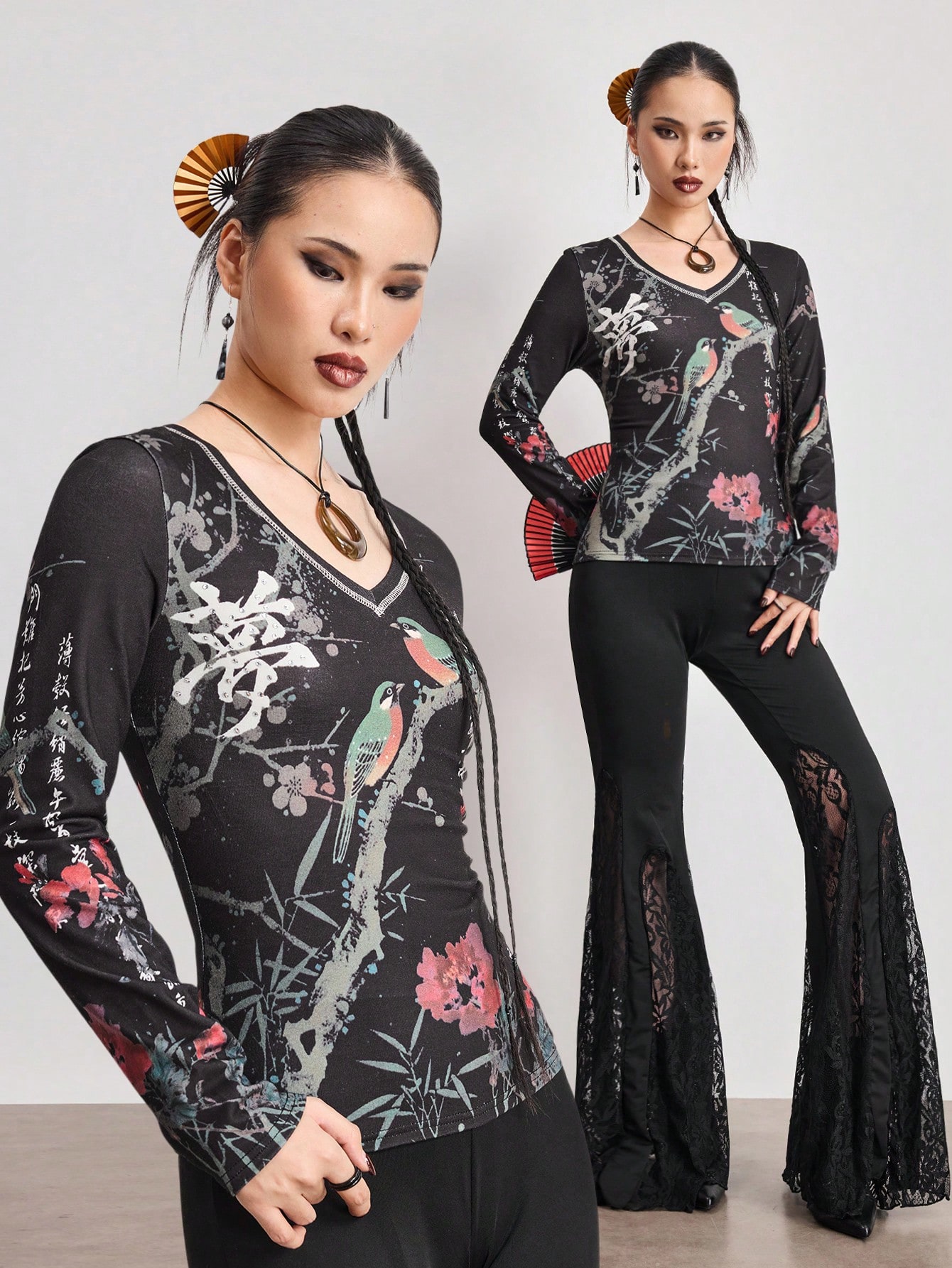 ROMWE Avant SpringVintage Y2K Chinese Character & Rhinestone Embellished Fitted T-Shirt