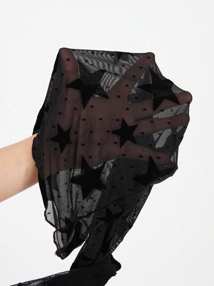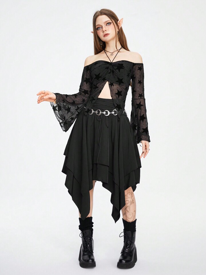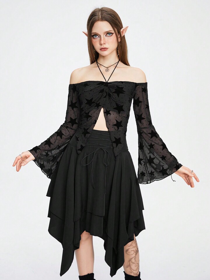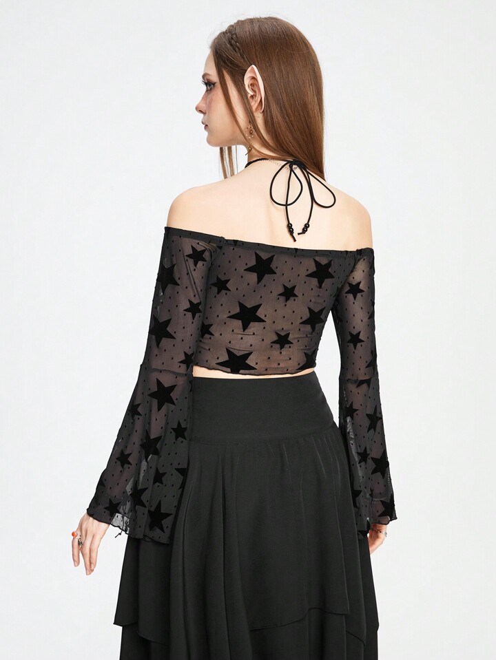 ROMWE Avant Star Print Off Shoulder Flounce Sleeve Split Hem Mesh Top