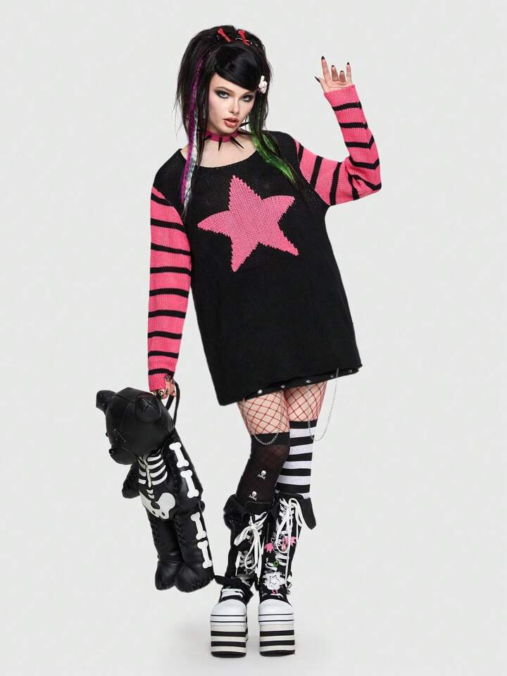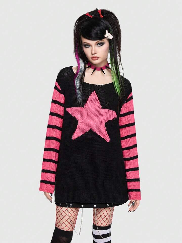 ROMWE Avant Striped & Star Pattern Drop Shoulder Sweater