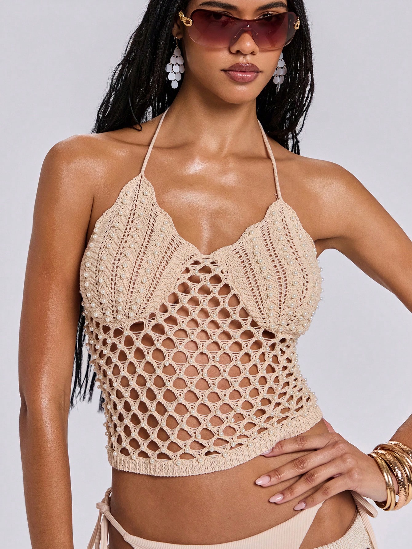 ROMWE Avant Vacation Beach Beaded Decor Backless Halter Hollow Out Knit Blouse