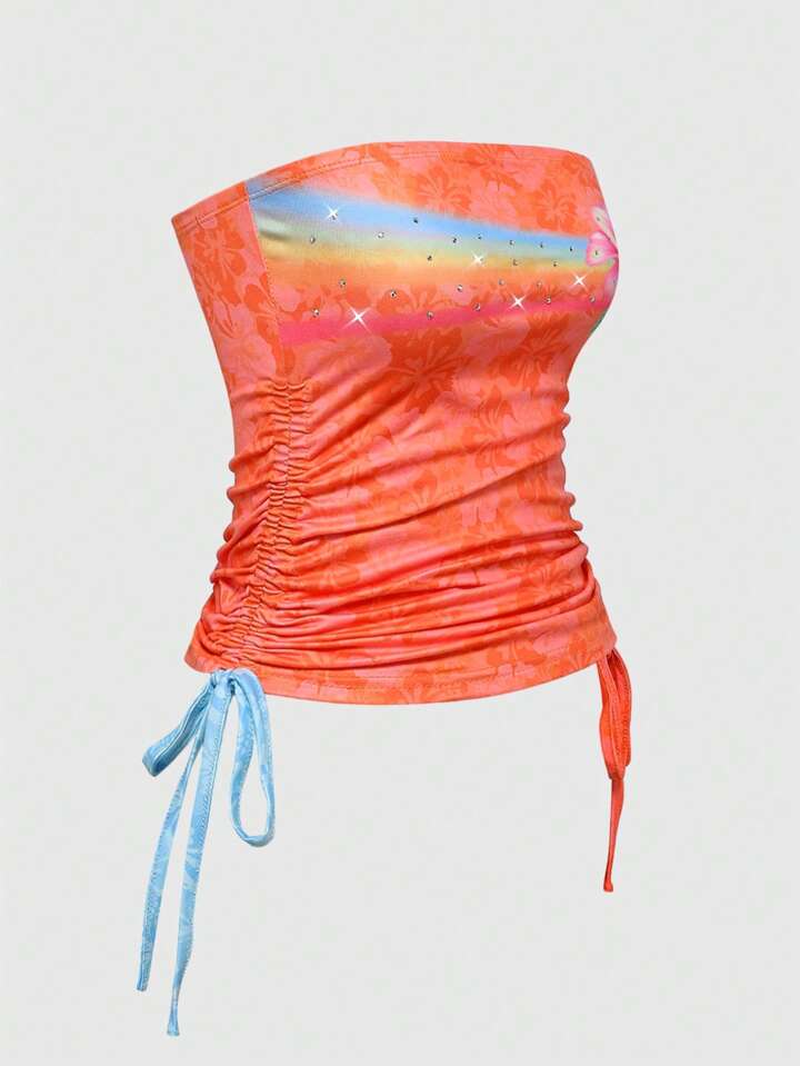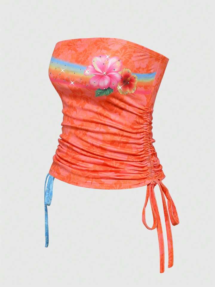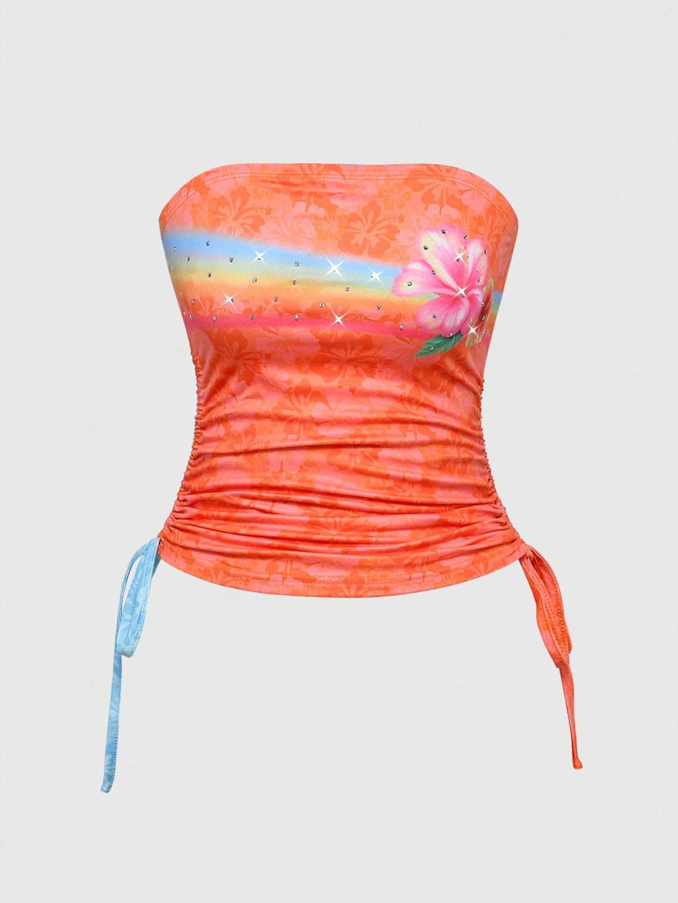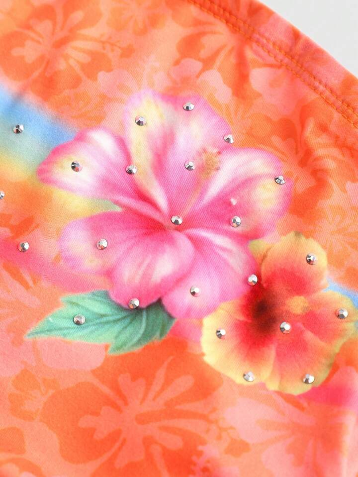 ROMWE Avant Women's Hibiscus Flower & Rhinestone Embellished Bandeau Top For Vacation/Holiday