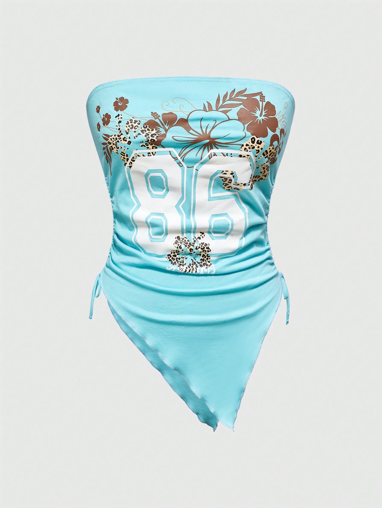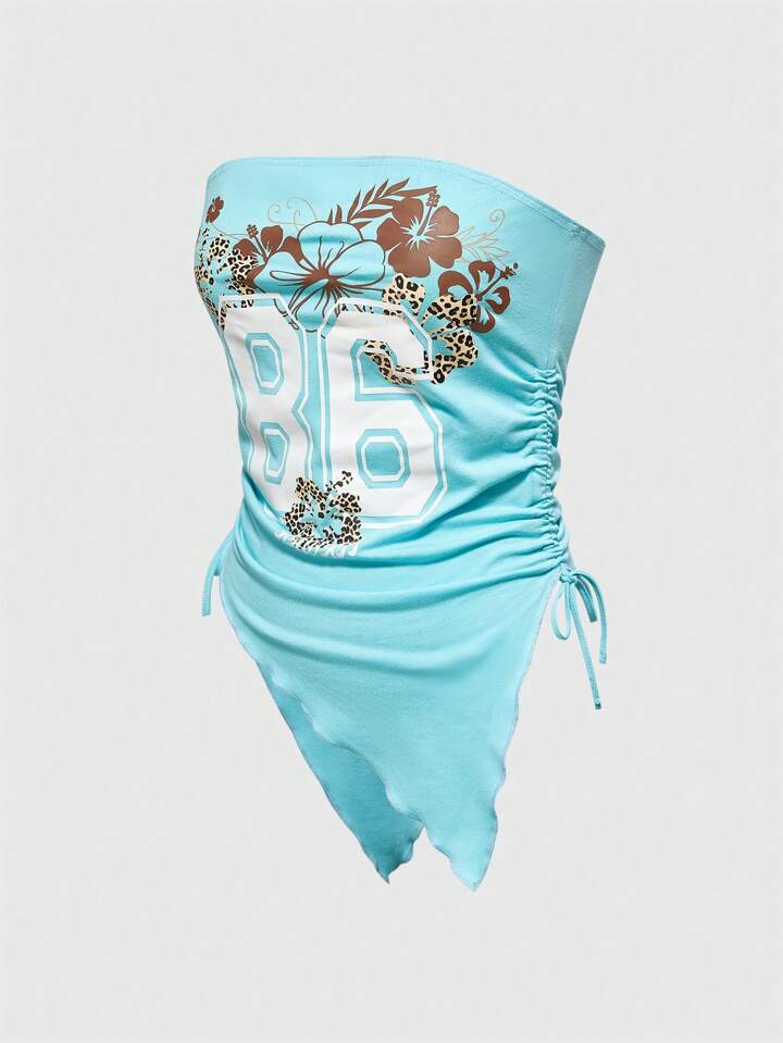ROMWE Avant Women's Resort Island Hibiscus & Leopard Print Drawstring Bustier Top