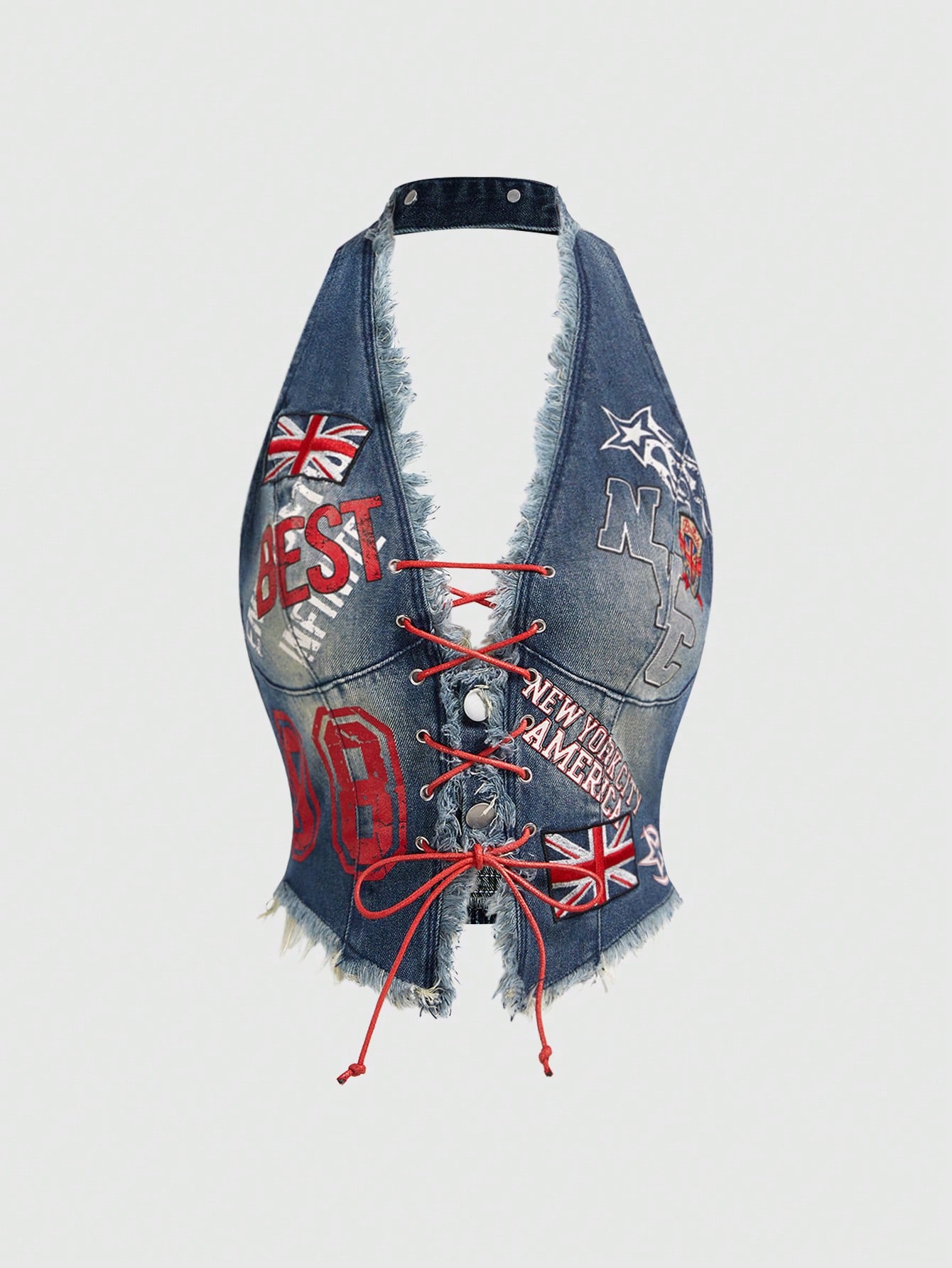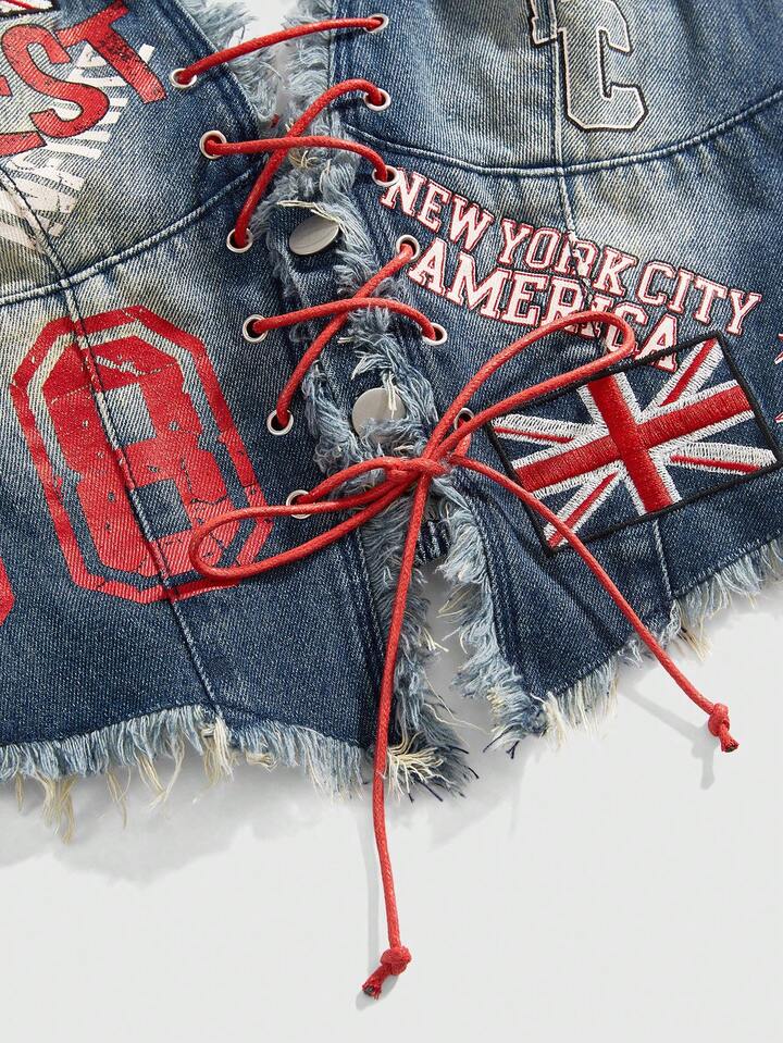 ROMWE Avant Women's Retro Motorcycle Style Back To School Collegiate Numeric & English Text British Flag Print Sleeveless Denim Crop Top