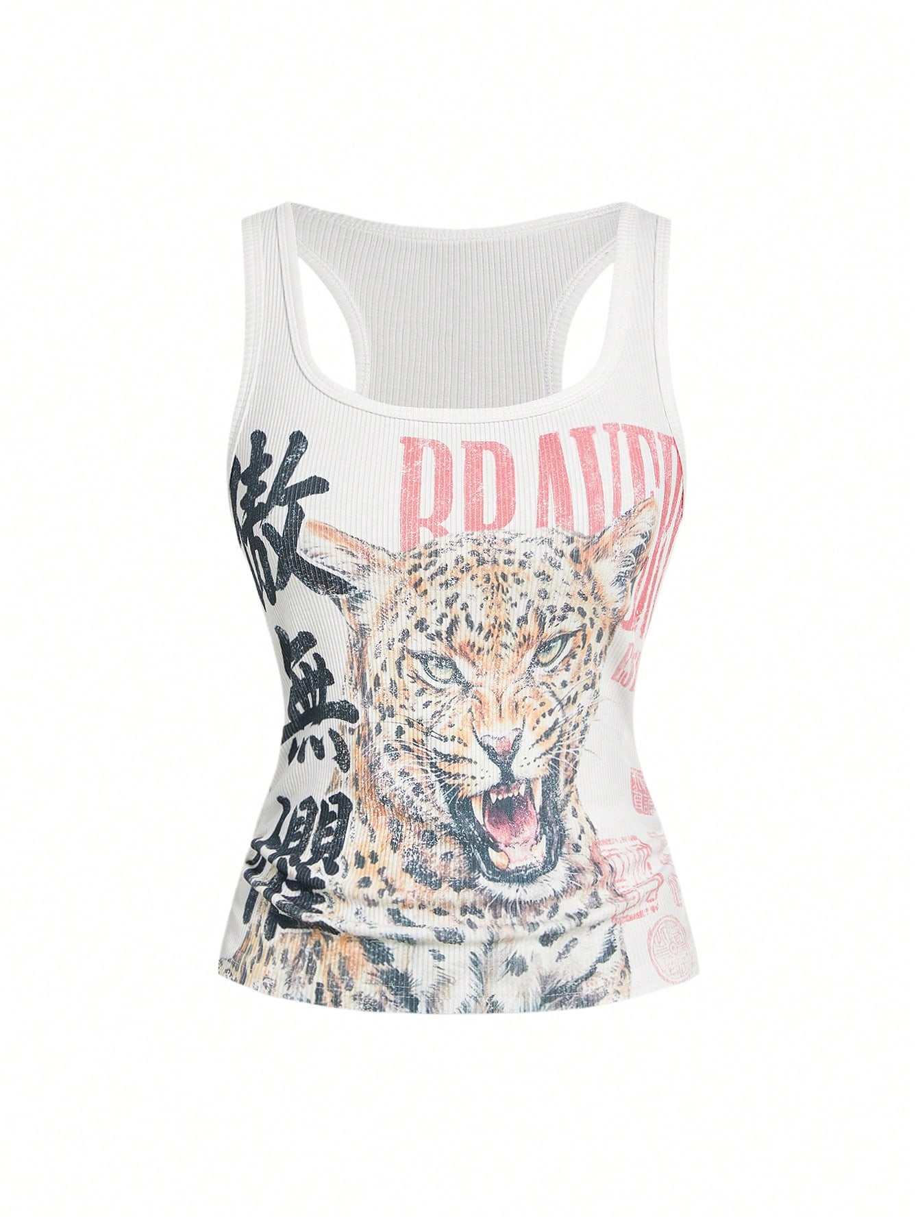 ROMWE Avant Women's Retro New Chinese Style Leopard Chinese & English Print All-Match Tank Top, Versatile