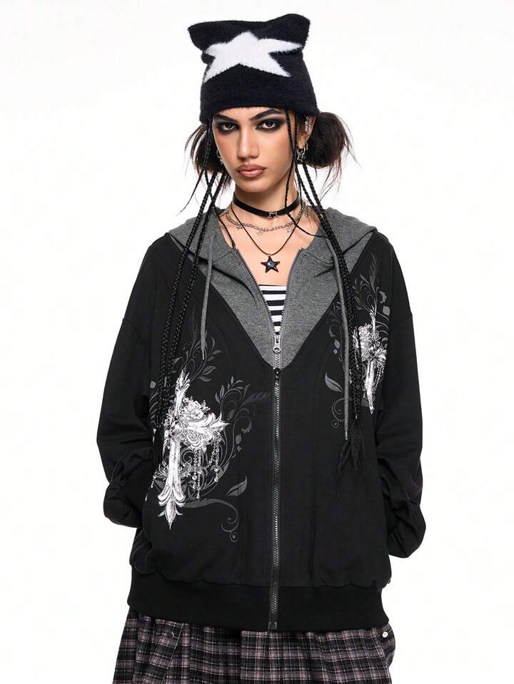 ROMWE Avant Women's Retro Y2K 2 In 1 Patchwork Thorn Vine & Cross Rhinestones Sweatshirt