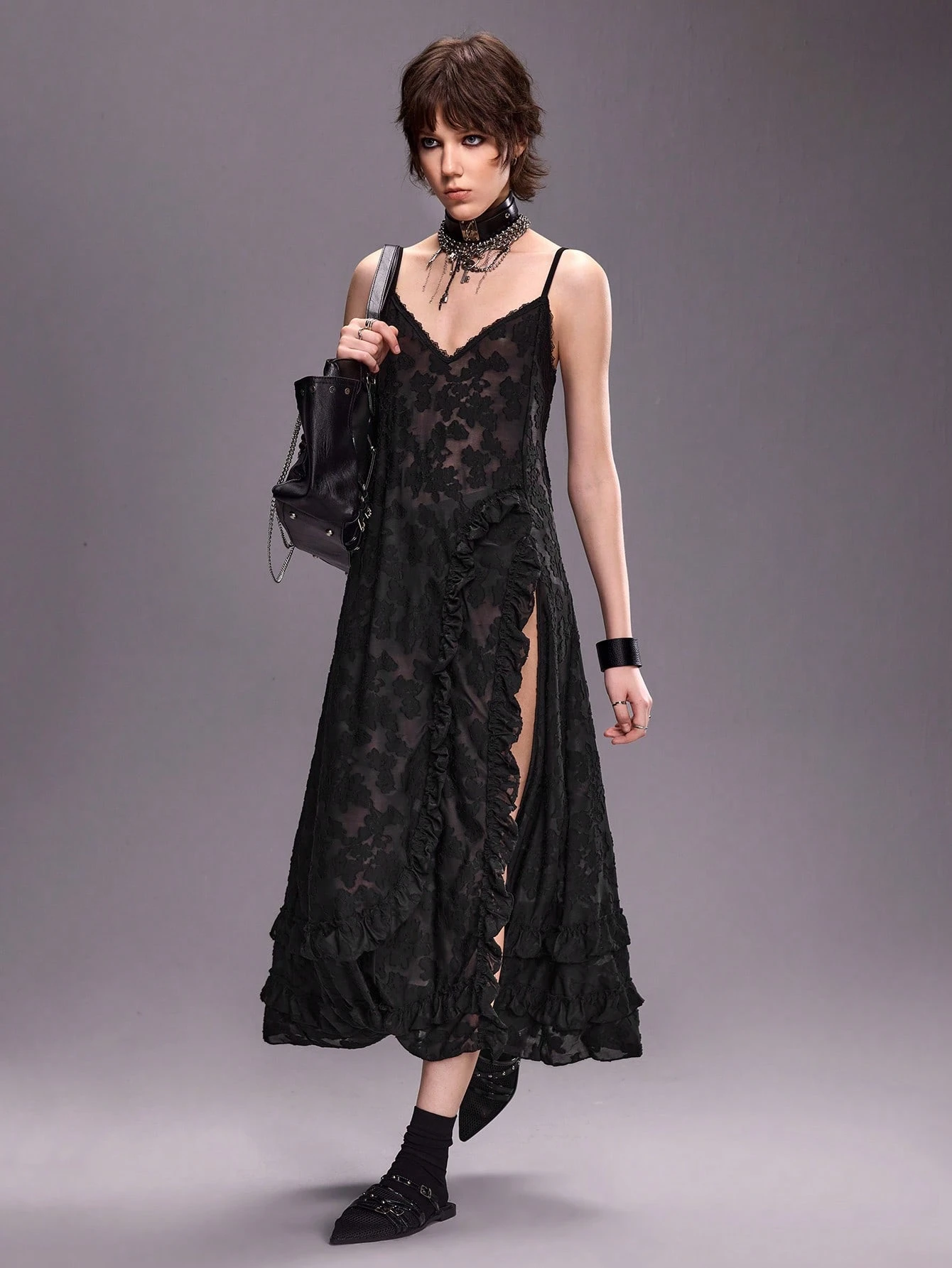 ROMWE Avant Women's Spaghetti Strap Asymmetrical High Slit Ruffle Lace Overlay Maxi Dress