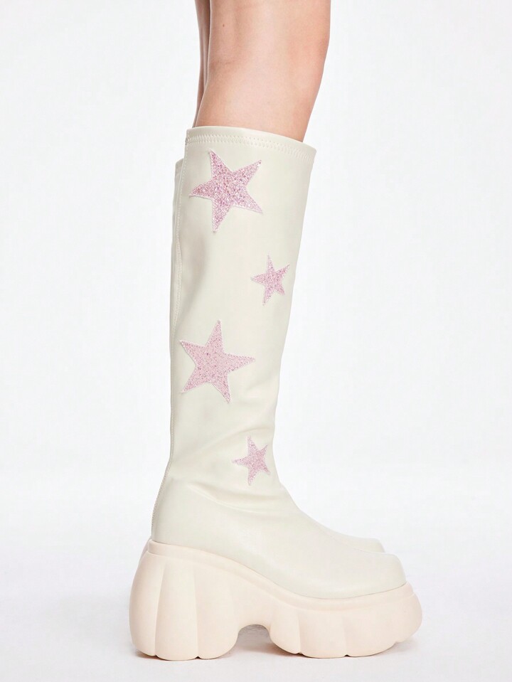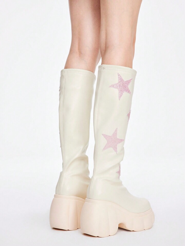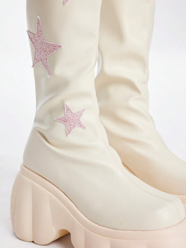 ROMWE Avant Women's Thick-Soled New Model Beige Riding Boots With Star-Shaped Height-Increasing Design