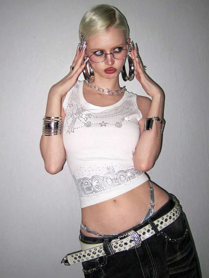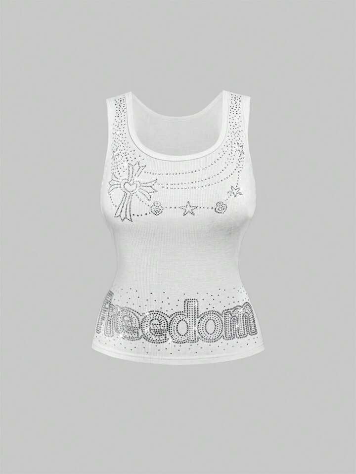 ROMWE Avant Y2K Rhinestoned Cross Bling English Hot Girl Graphic Tank Top For Women