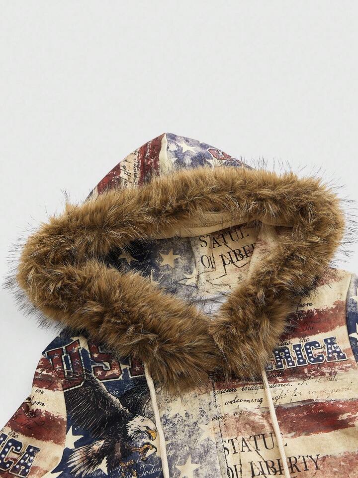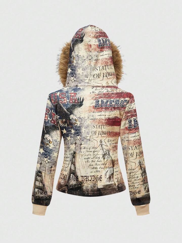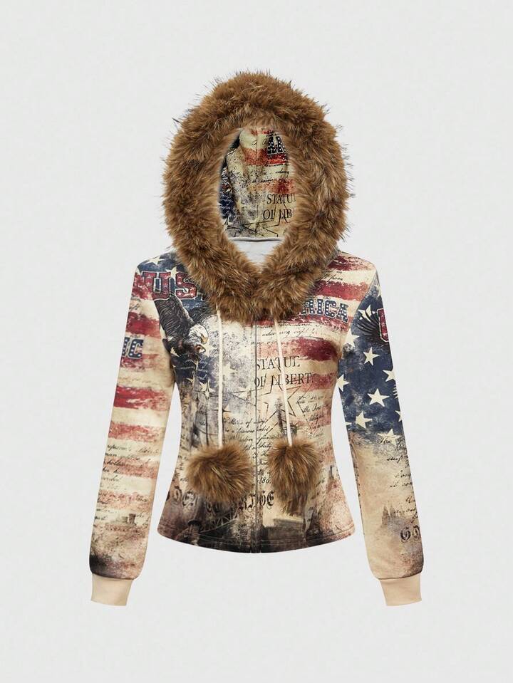 ROMWE Avant Y2K Streetwear Oversized Eagle & American Flag Print Hooded Sweatshirt Sweatshirt For Women