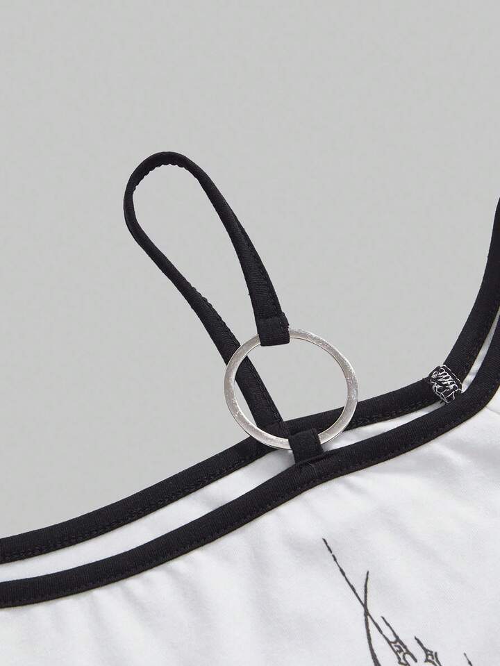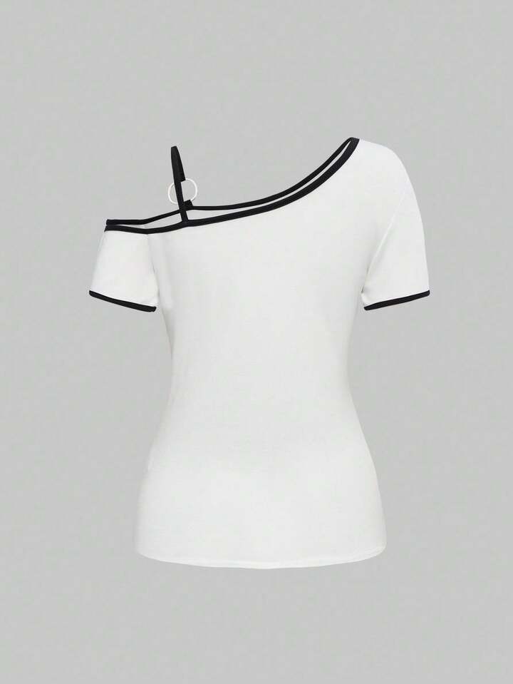 ROMWE Avant Y3K Avant-Garde Figure Print Asymmetric Shoulder Short Sleeve Elastic Ruched Women T-Shirt