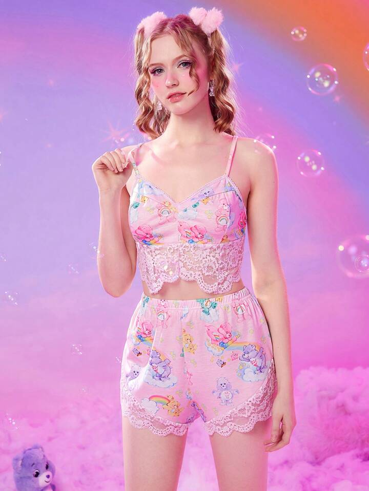 ROMWE X Care Bears Bear Print Contrast Lace PJ Set