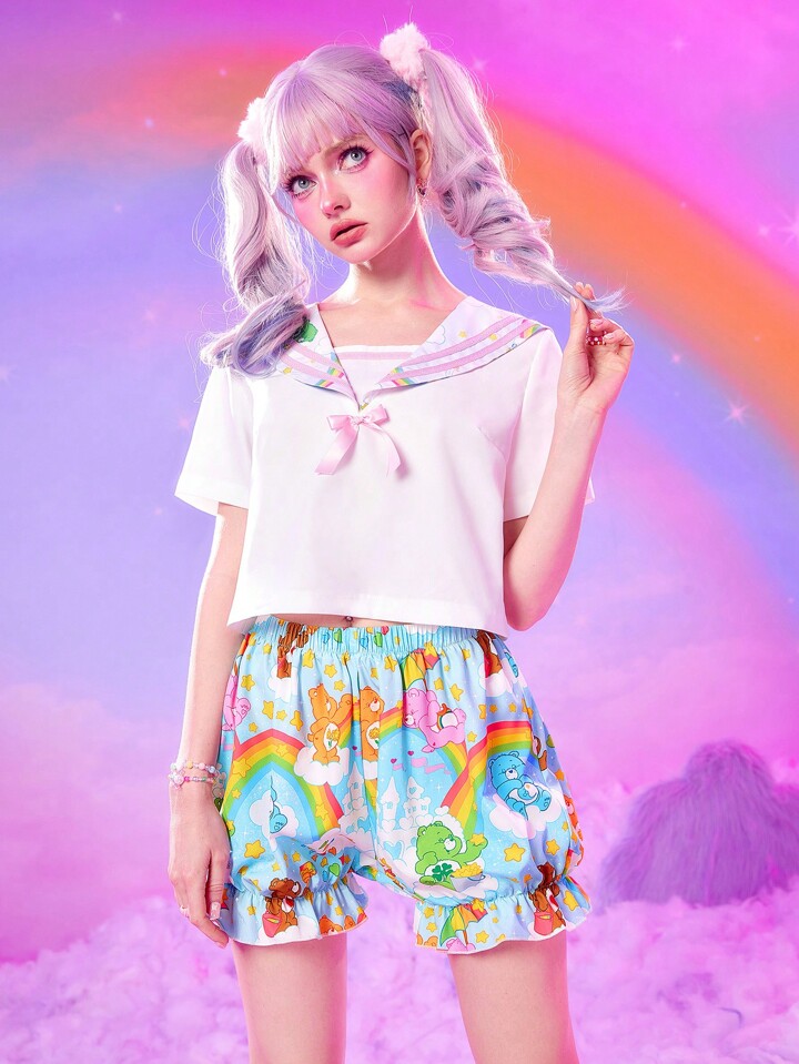 ROMWE X Care Bears Cartoon Graphic Ruffle Hem Shorts