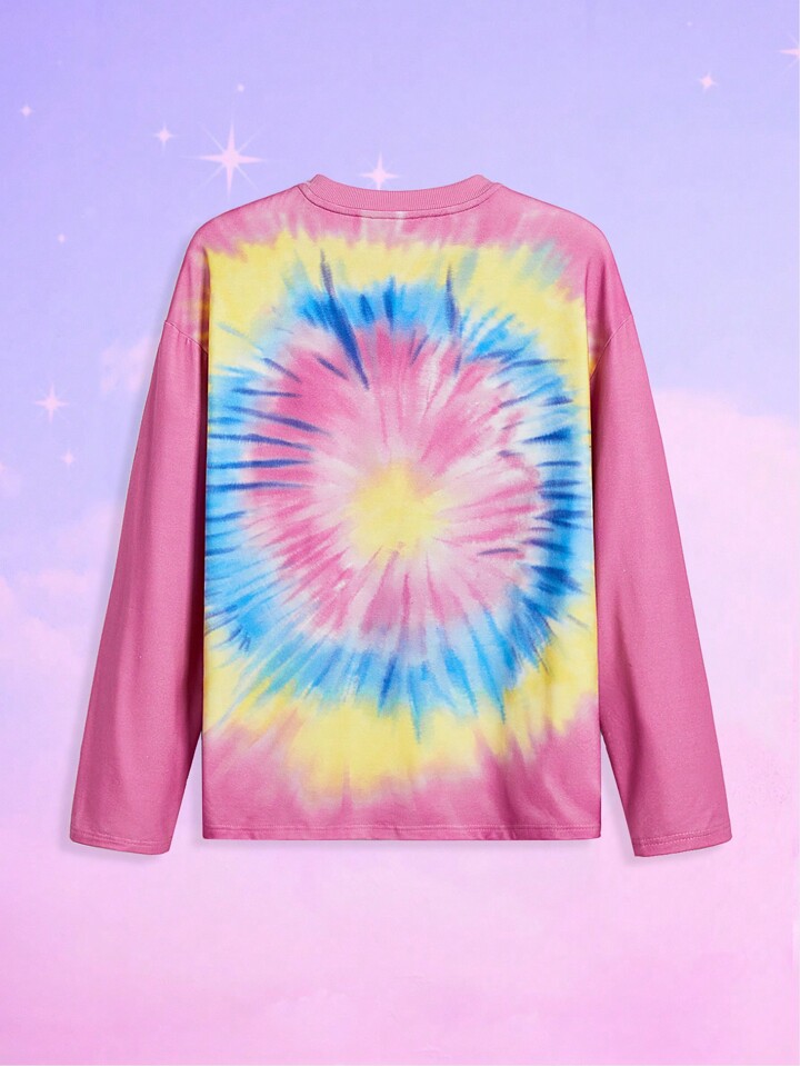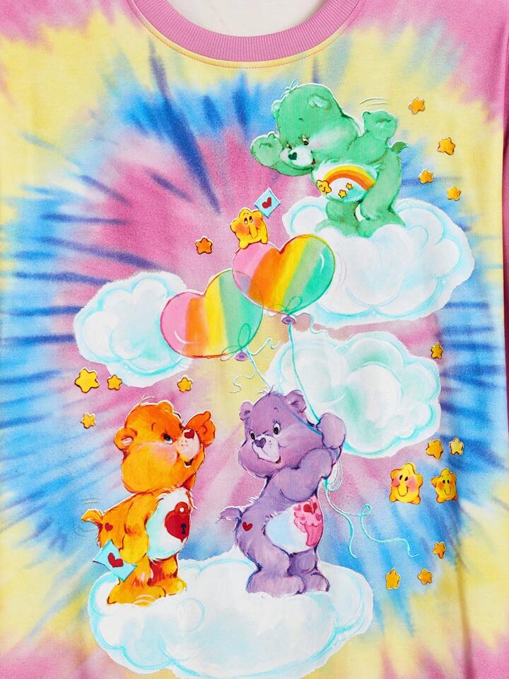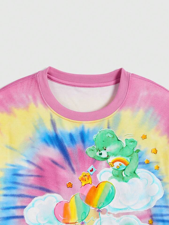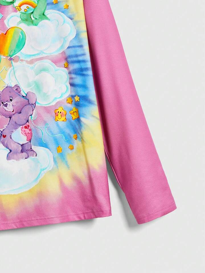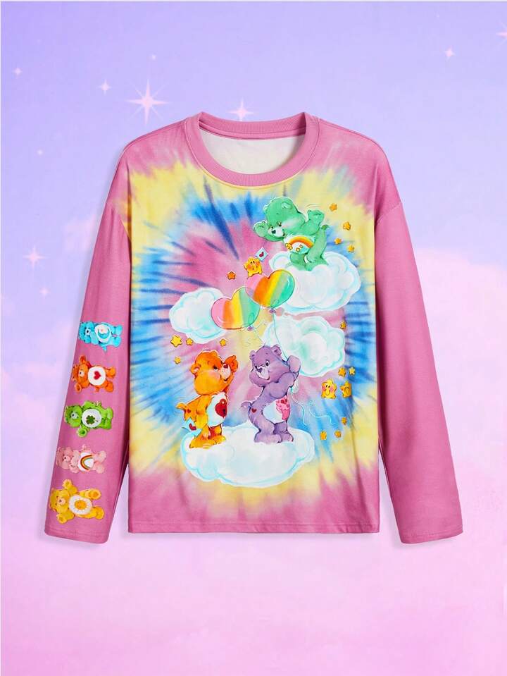 ROMWE X Care Bears Cute Cartoon Bear And Tie Dye Printed Drop Shoulder Oversized Long Sleeve T-Shirt