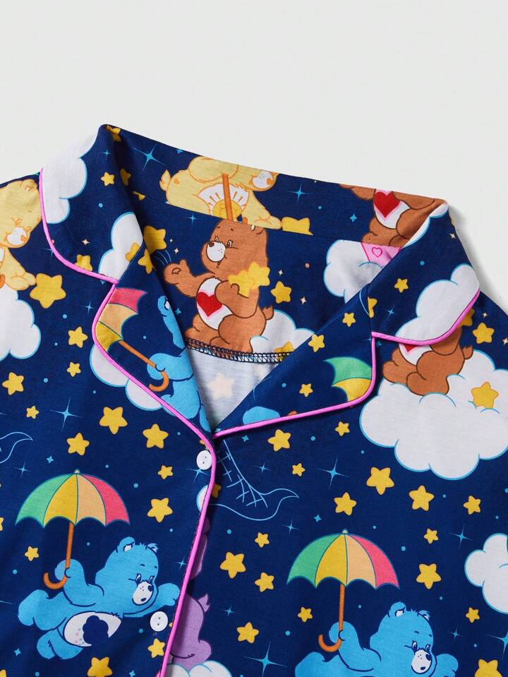ROMWE X Care Bears Plus Size Casual Short Sleeve Sleepwear Set With Open Front And Lapel, School