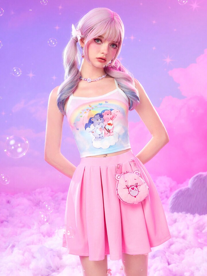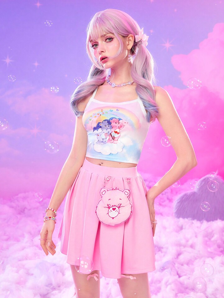 ROMWE X Care Bears Solid Pleated Skirt With Bear Bag