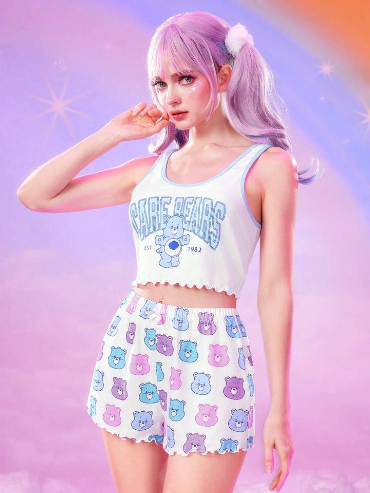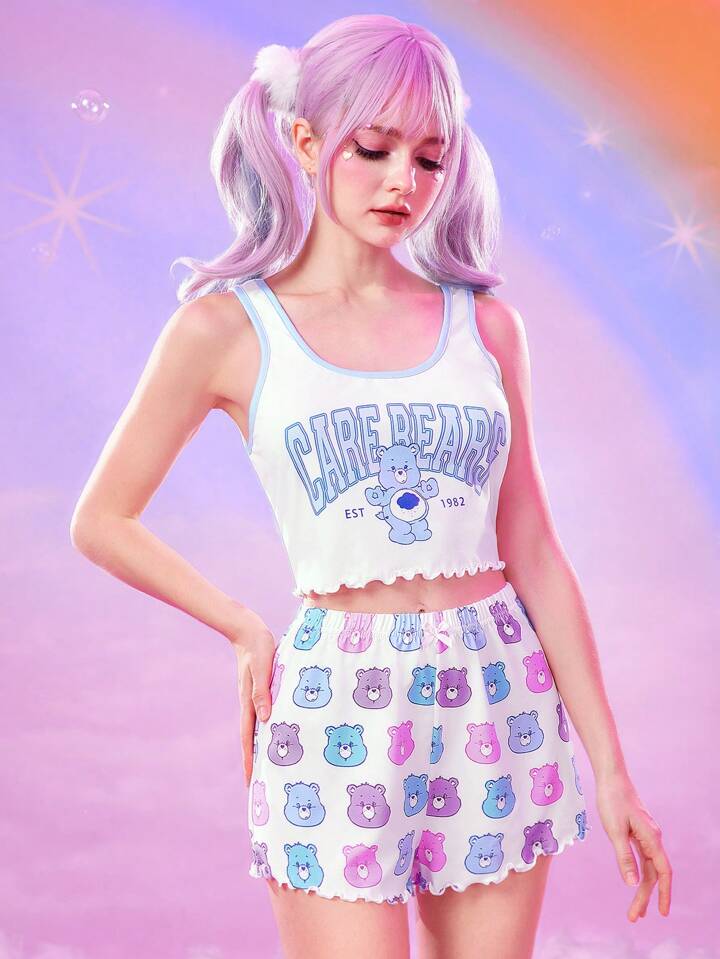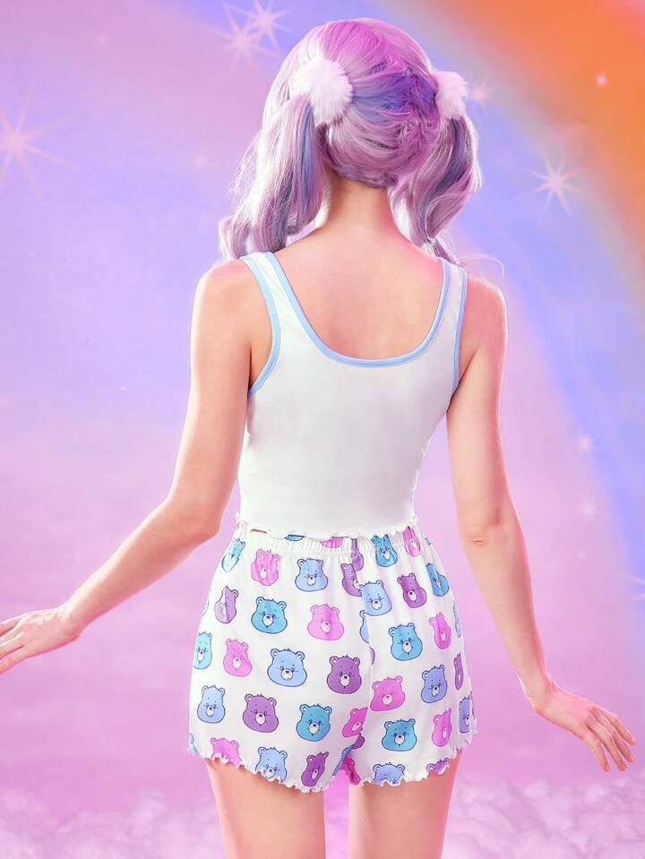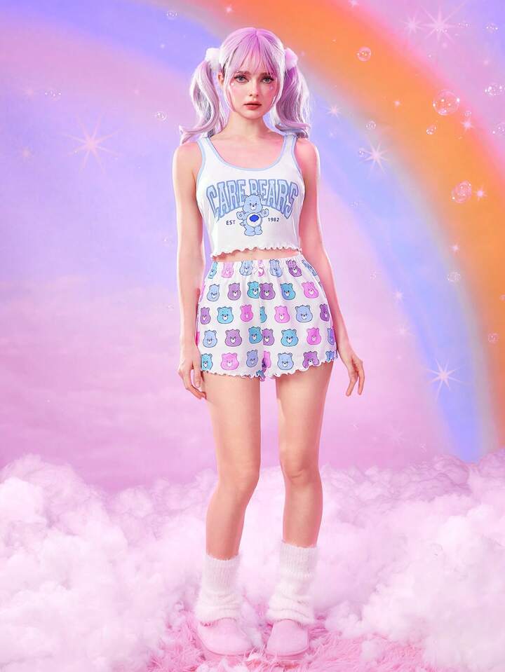 ROMWE X Care Bears Women's Cute Cartoon Bear Print Lettuce Trim Crop Tank Top & Shorts Pajama Set