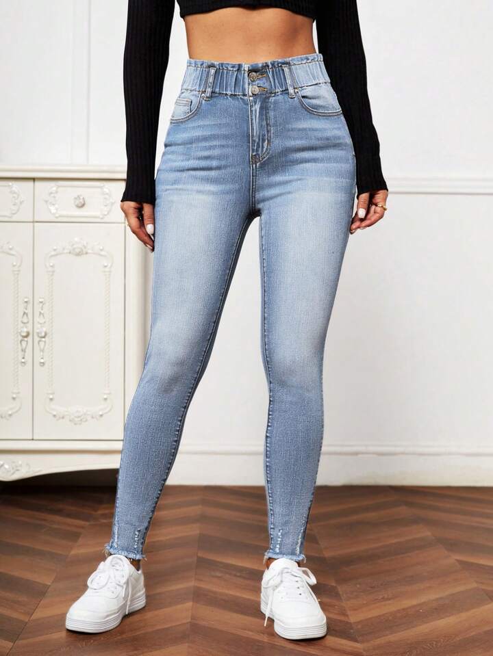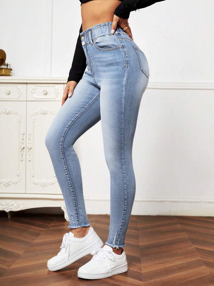 Ripped Frayed Hem Bleach Wash Paperbag Waist Skinny Jeans