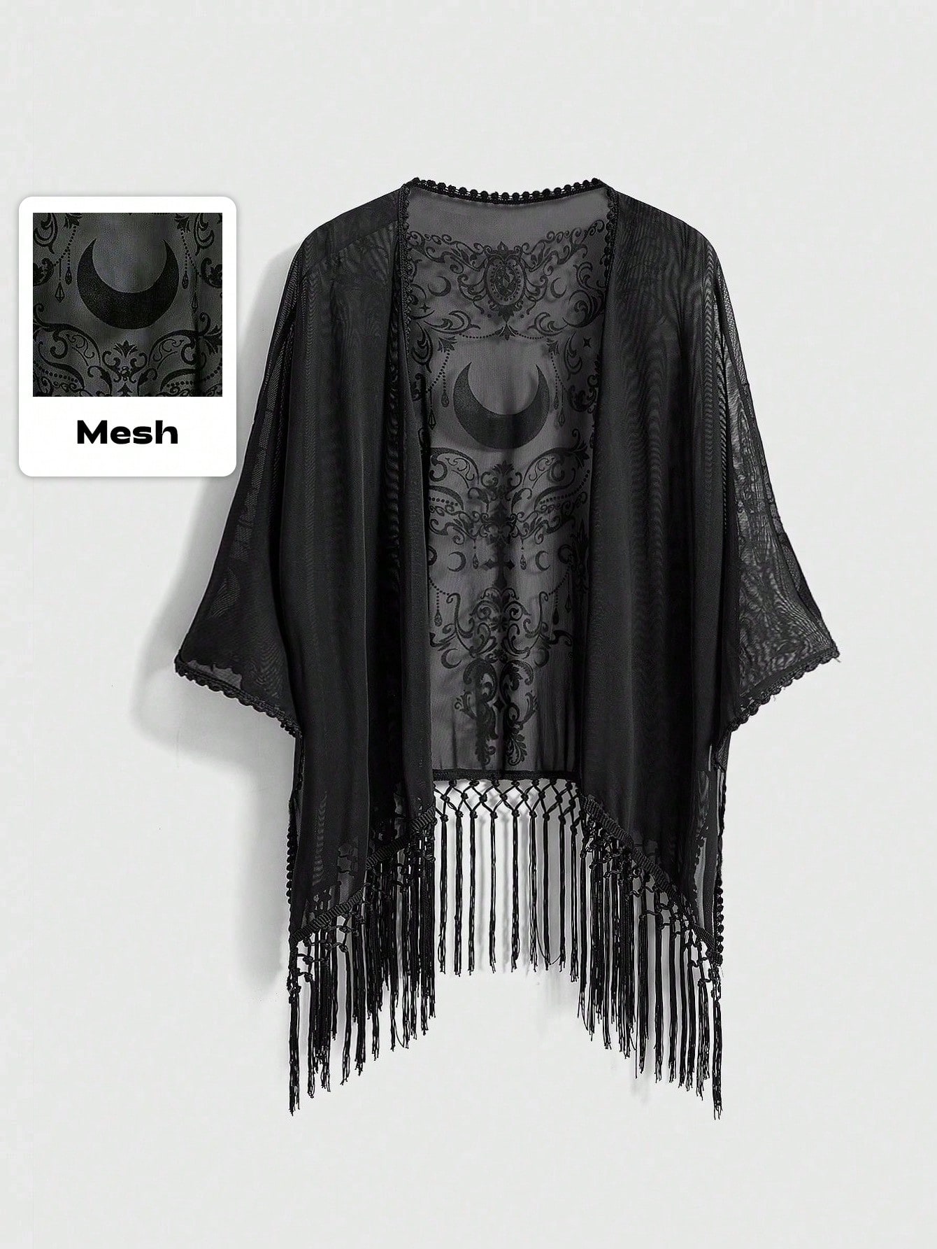 EDITION Romantic Gothic Vintage Baroque Moon And Vine Pattern Flocked Fabric Bohemian Textured Asymmetrical Tassel Hem Cardigan Shawl Blouse For Women, Spring/Summer