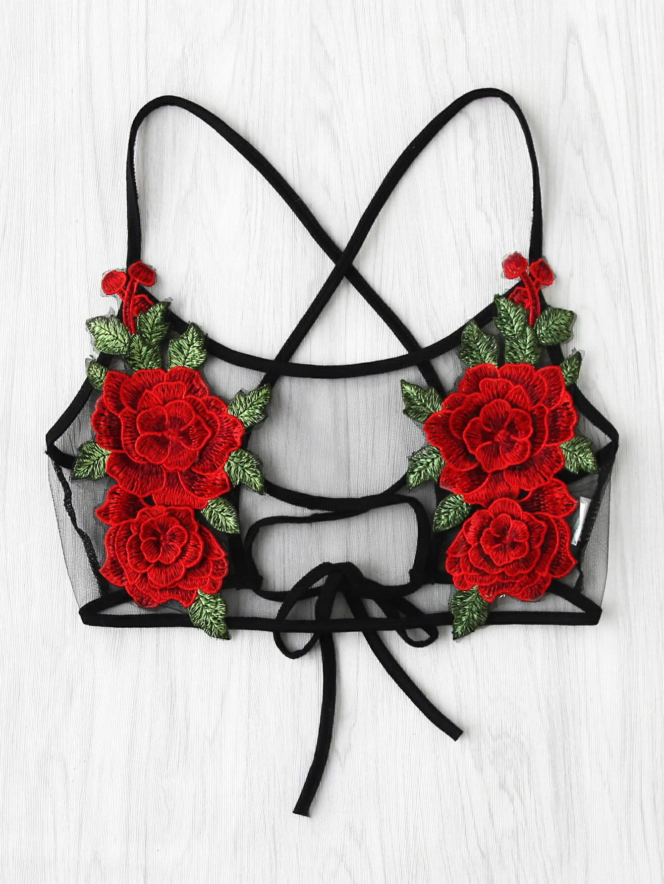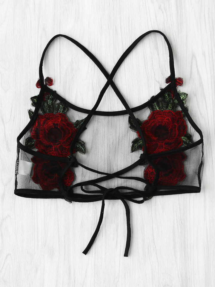 Rose Applique Lace Up Back Sheer Mesh Bralet