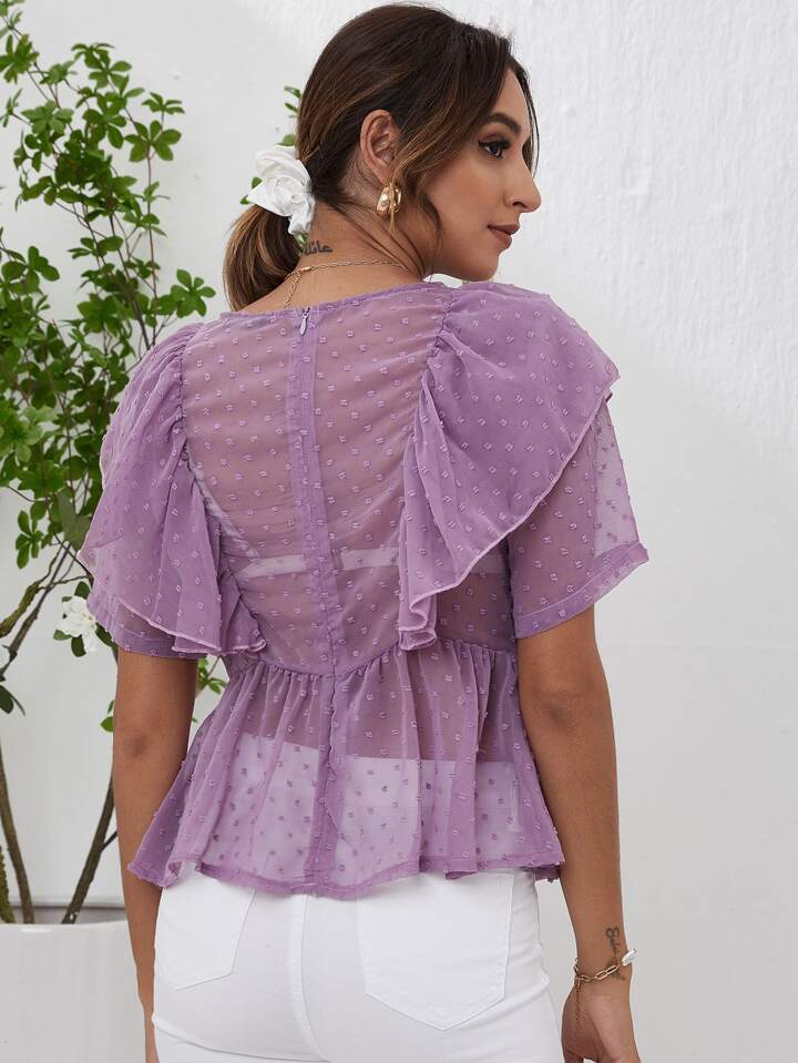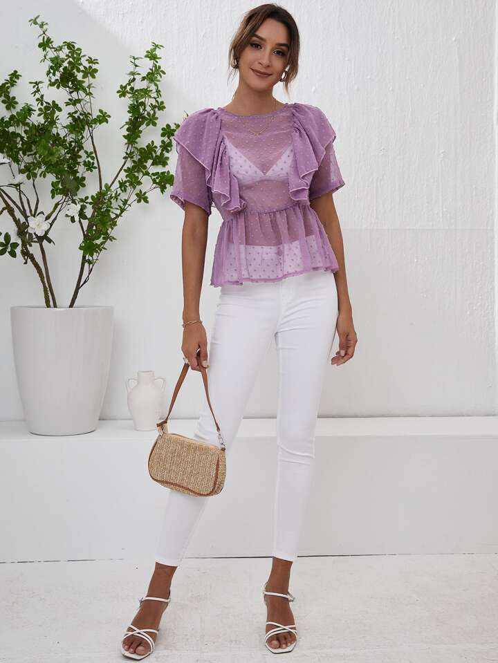Ruffle Detail Swiss Dot Chiffon Sheer Peplum Top Without Bra