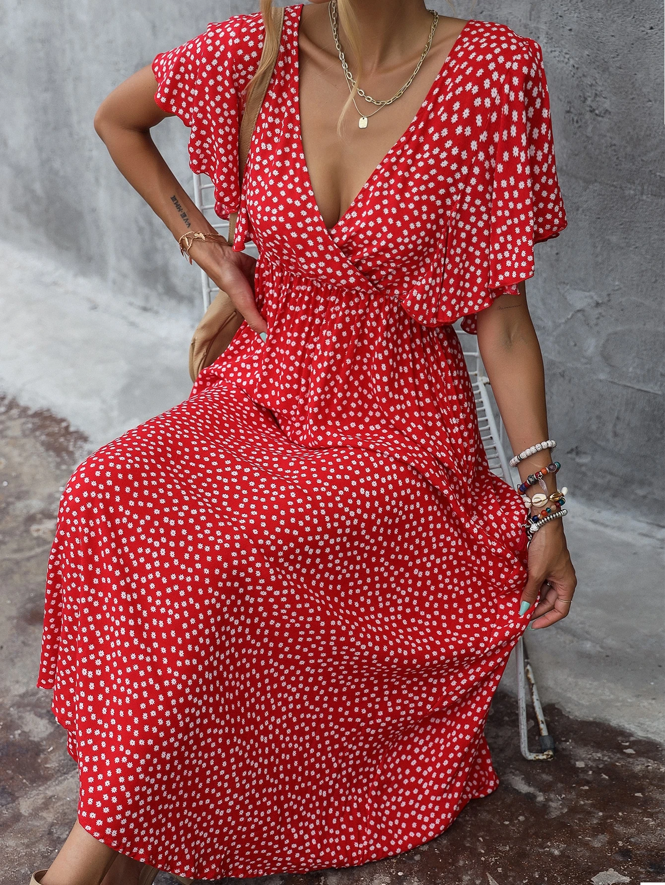 Ruffle Trim Surplice Neck Ditsy Floral Dress