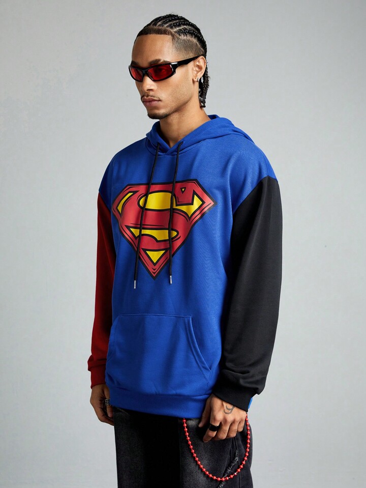 SUPERMAN X ROMWE Men's Logo Print Colorblock Drawstring Hoodie, Spring/Autumn