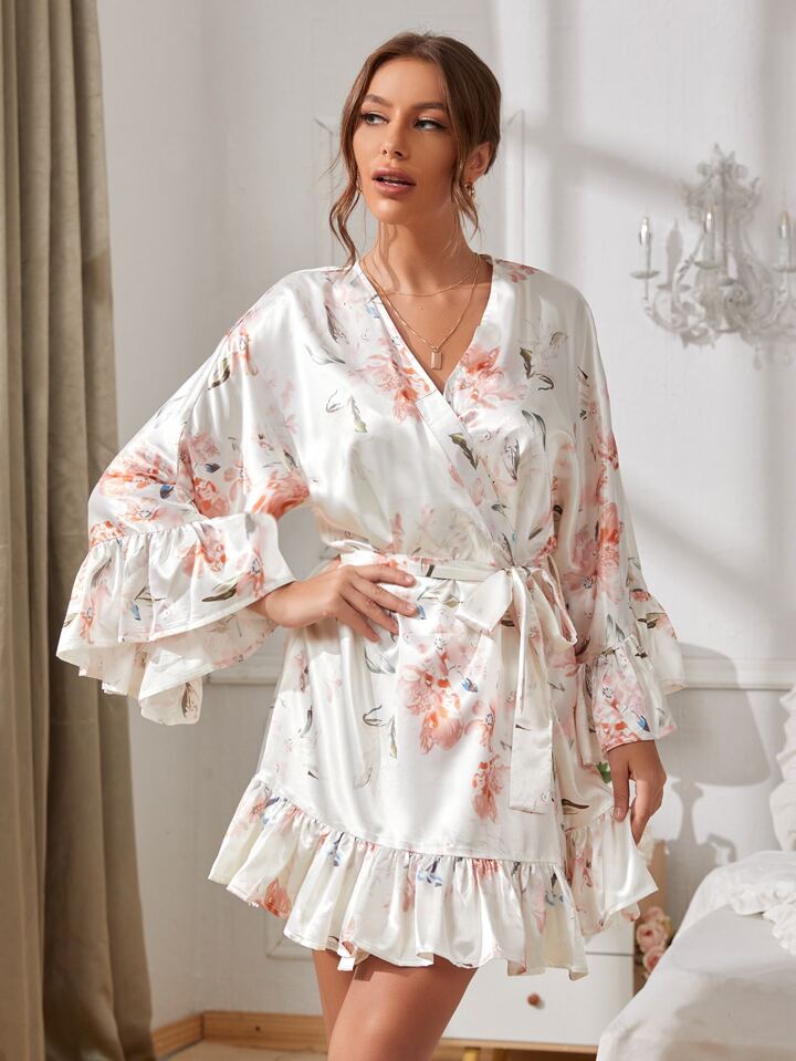 Satin Floral Print Ruffle Hem Belted Robe Without Night Dress