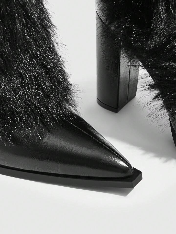 Sexy Fashion Fuzzy Ankle Boots, Pointed Toe, Chunky High Heels, Casual Versatile Side Zipper Black Boots For Women Valentine's Day