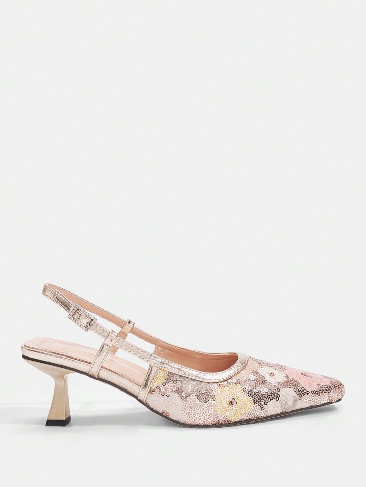 Sexy & Fashionable Champagne Color Sequins Rhinestones Decor Square Toe Casual Slingback High Heel Pumps For Women Spring Shoes Spring Break Easter Prom Heels