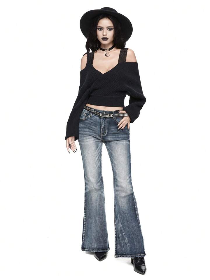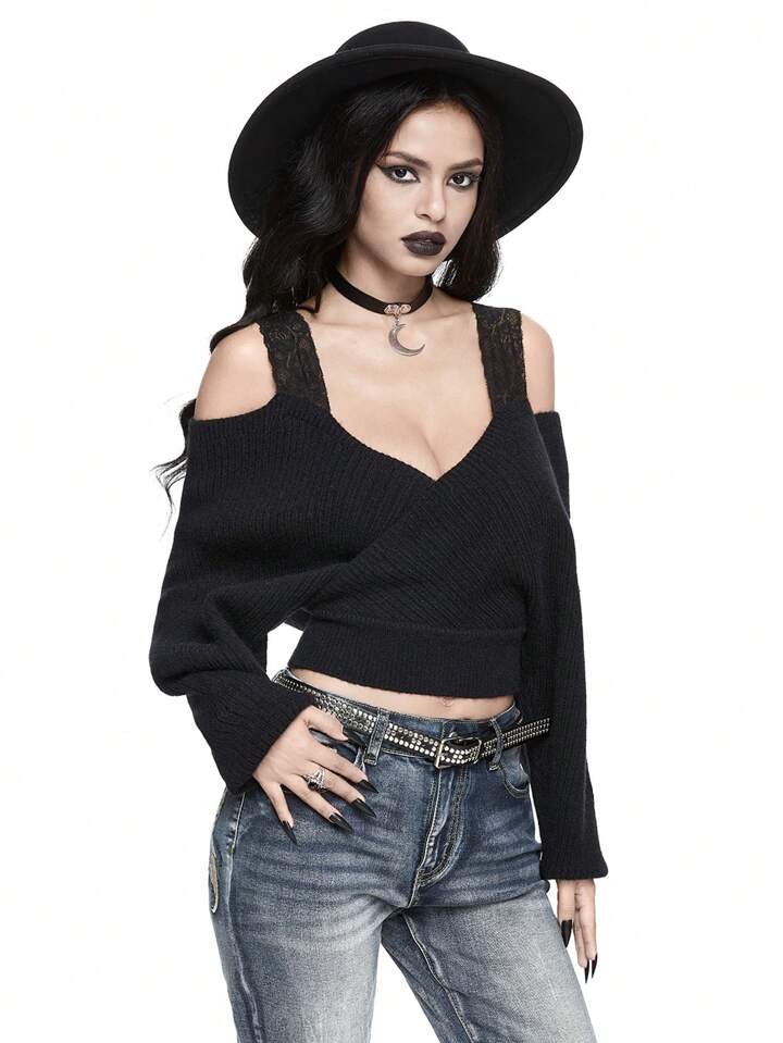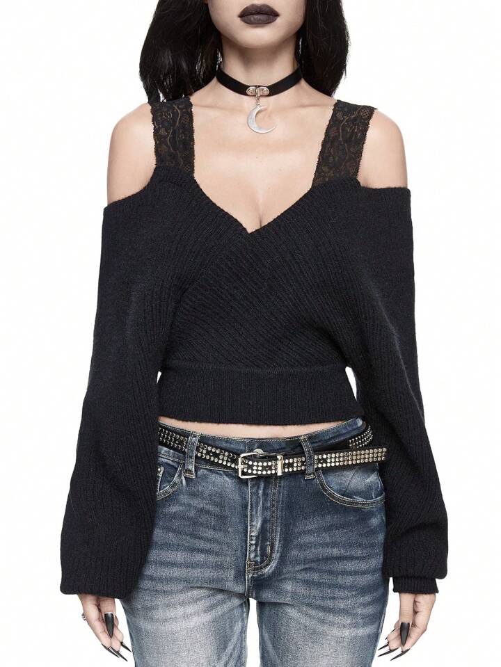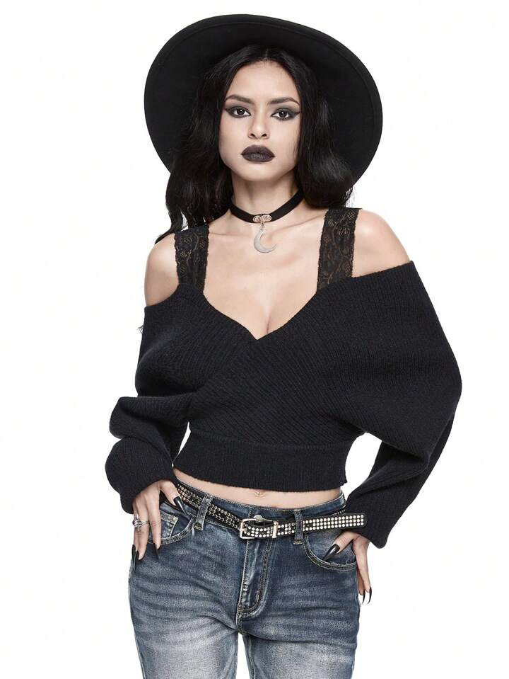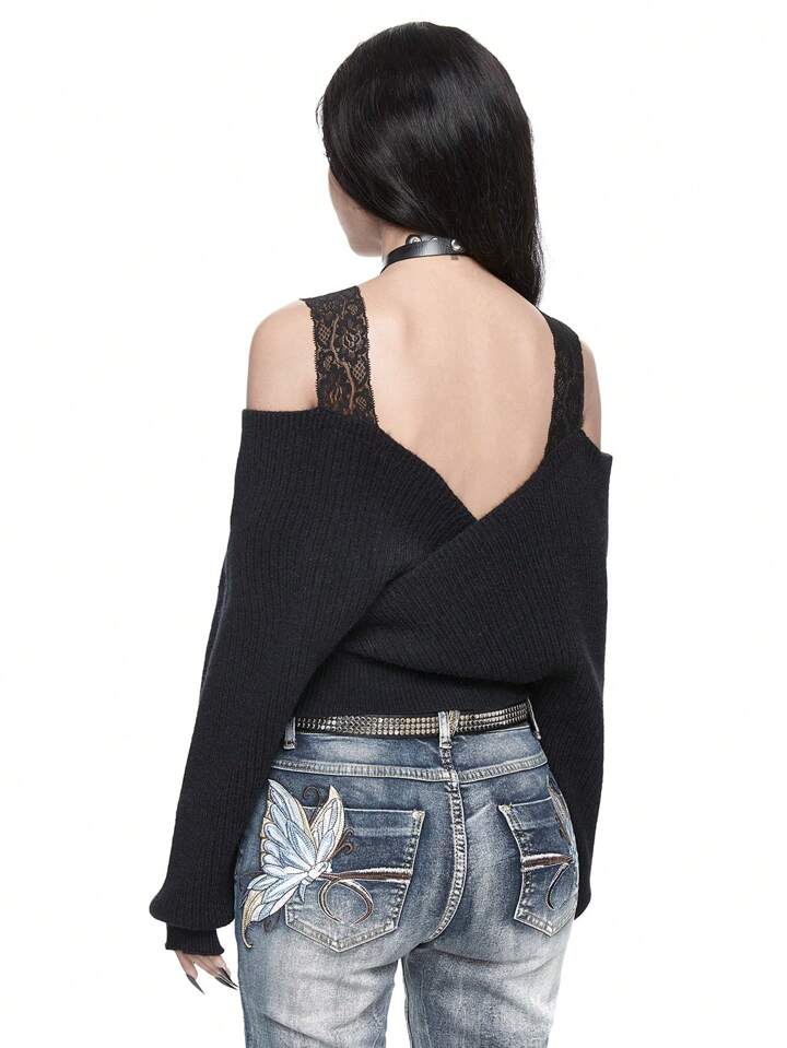 Sexy French Style V-Neck Off The Shoulder Lace Strap Pullover Sweater,Long Sleeve Tops