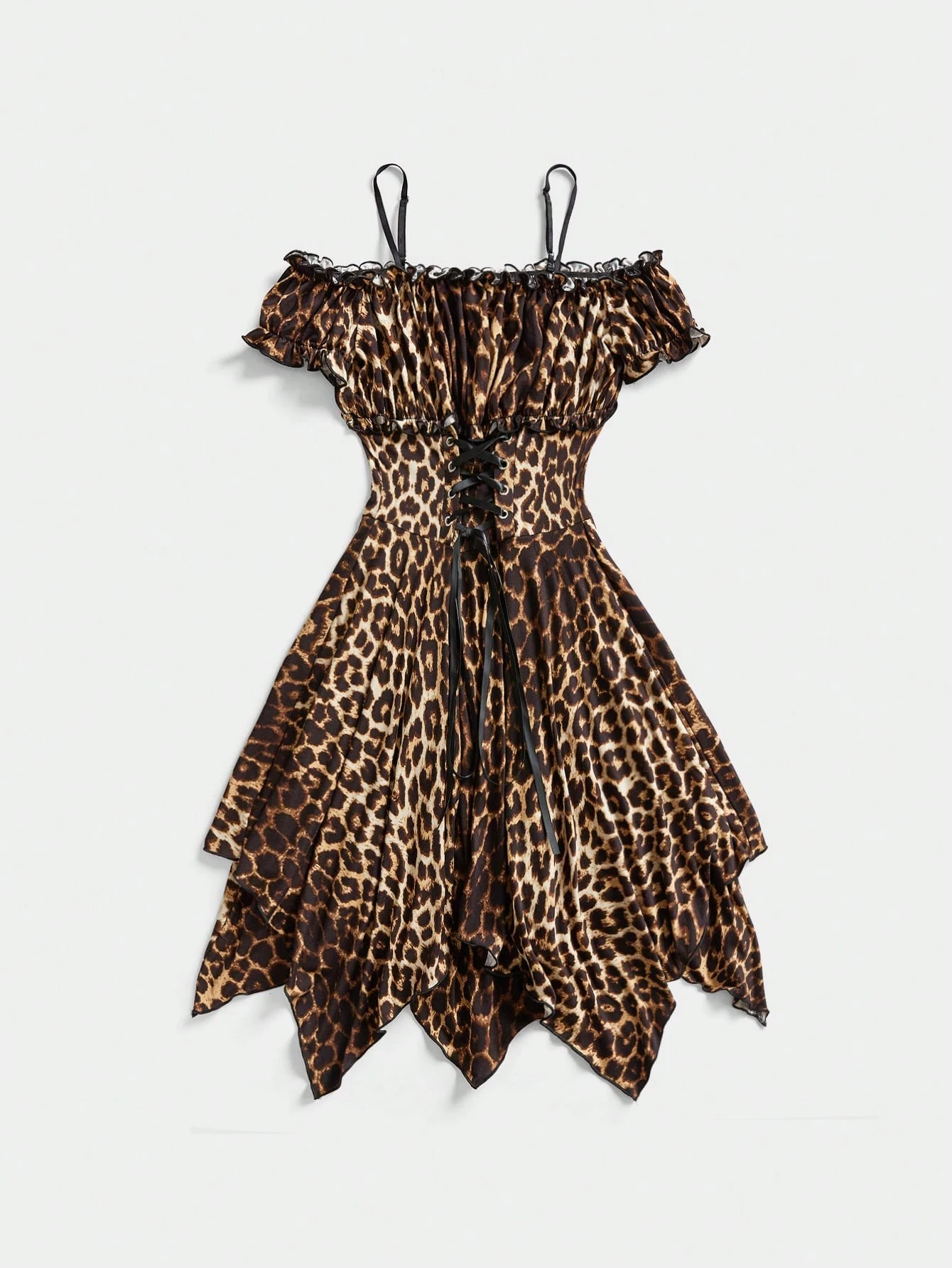 Sexy Hot Girl Leopard Print Off Shoulder Asymmetric Hem Women's Dress, Boho, Spring And Summer, Gyaru, ConcentOutfit Women/Rave Outfits Festival/ Rave Outfits, Spring Break/Spring Break Outfits, Sundress