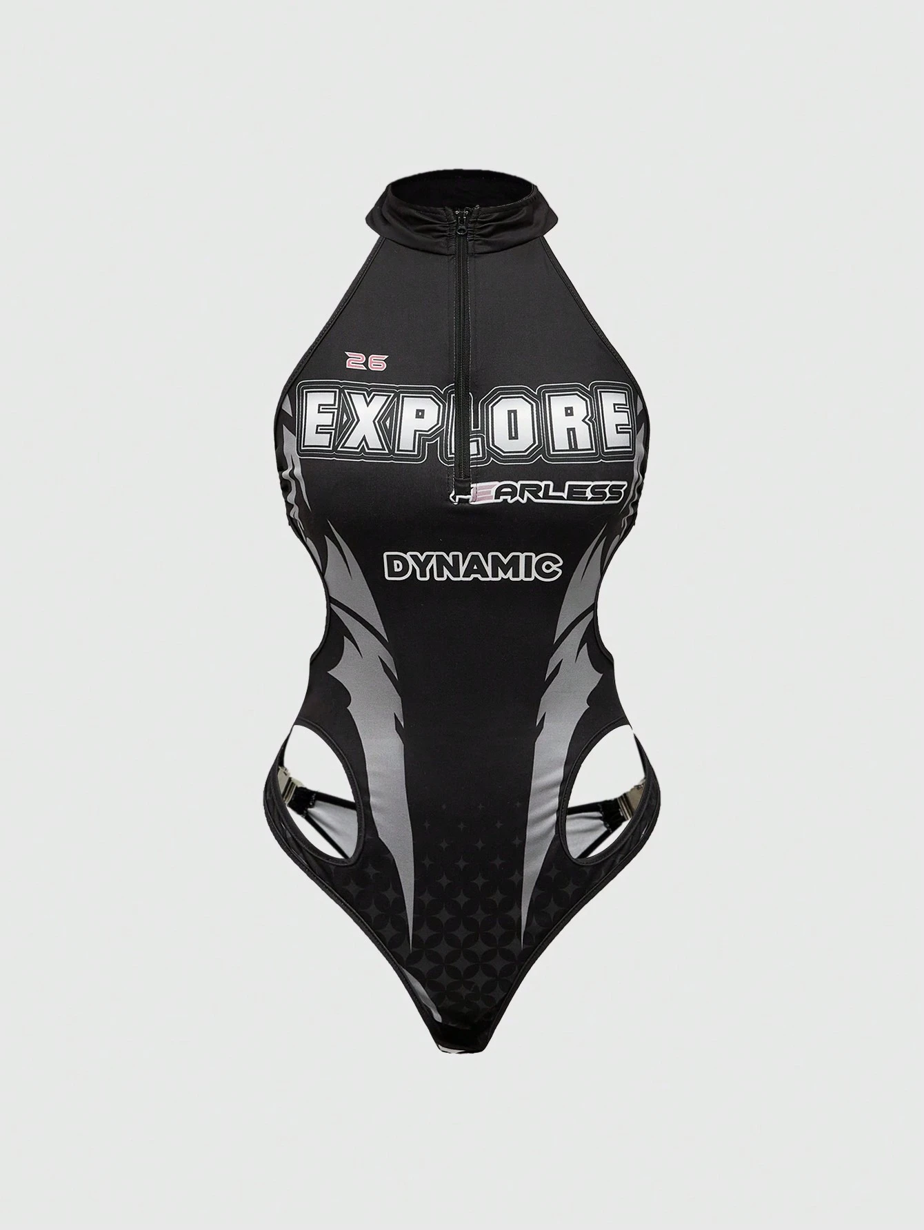 Grunge Punk Sexy Motorcycle Racing Words Logo Colorblock Splice Lace-Up Backless Bodysuit For Women