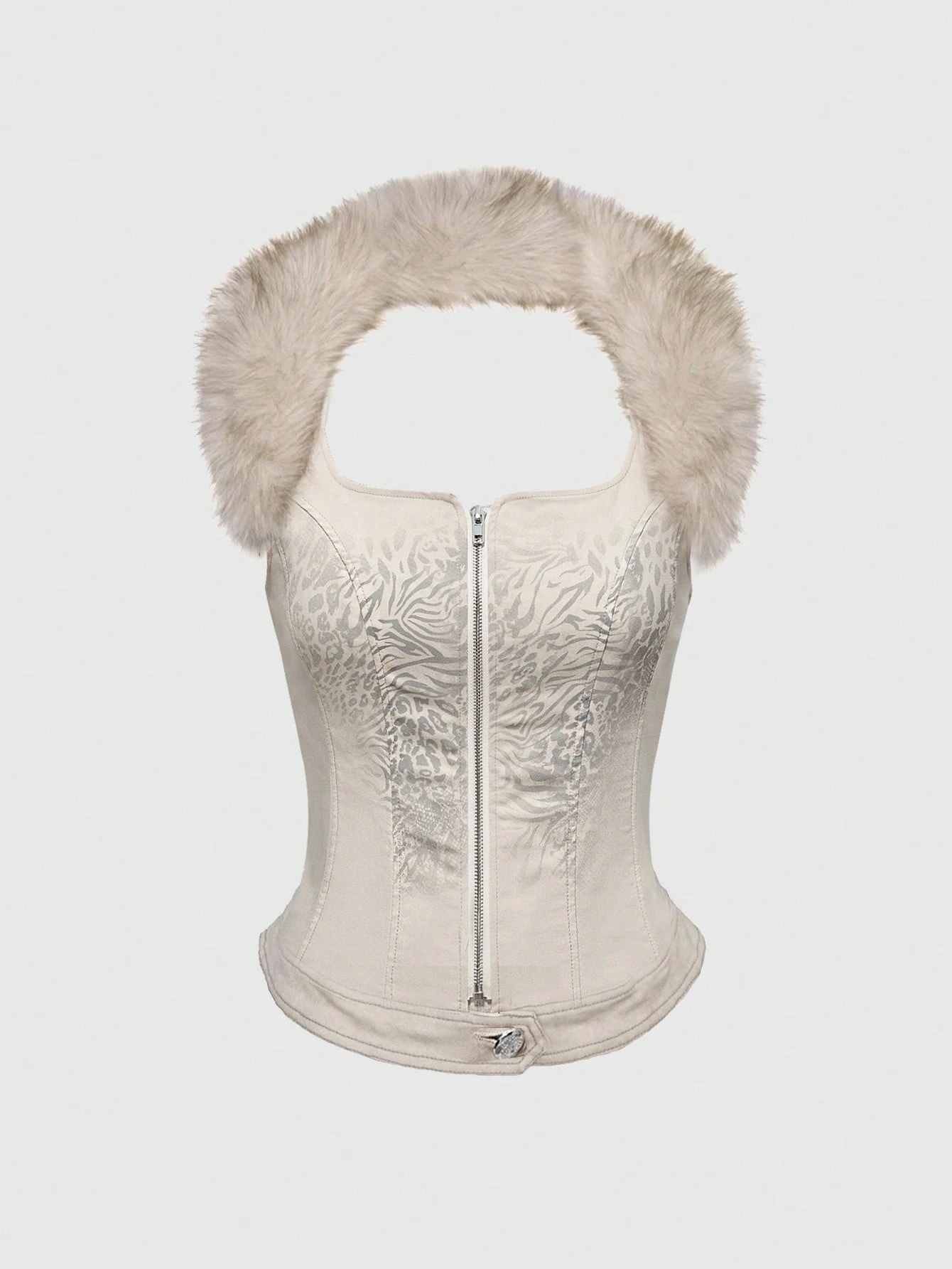 Grunge Punk Sexy Retro Detachable Faux Fur Collar Animal Print Fitted Women Tank Top